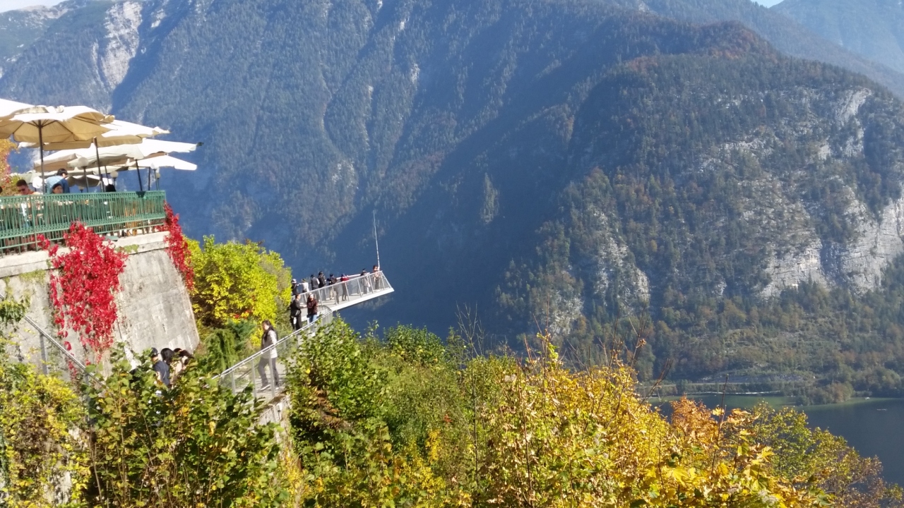 ツアーで訪問しました。エレベーターで上まで上がれます。「世界遺産展望橋」というのが正式名称ですが、橋というより張り出した展望台です。ハルシュッタ湖が見下ろせ、絶景が見られるので、世界各地から来た観光客が順番に写真を撮っています。