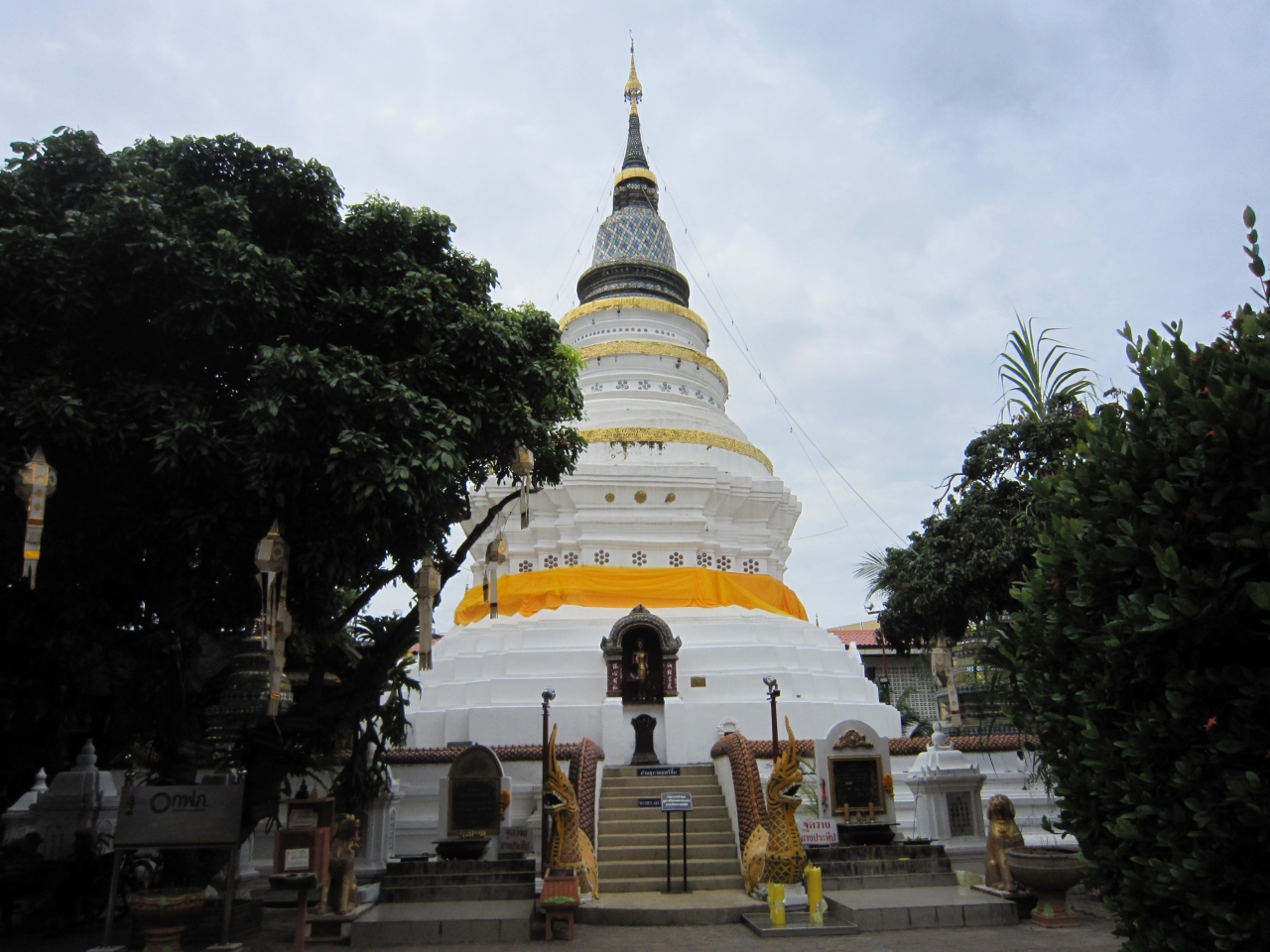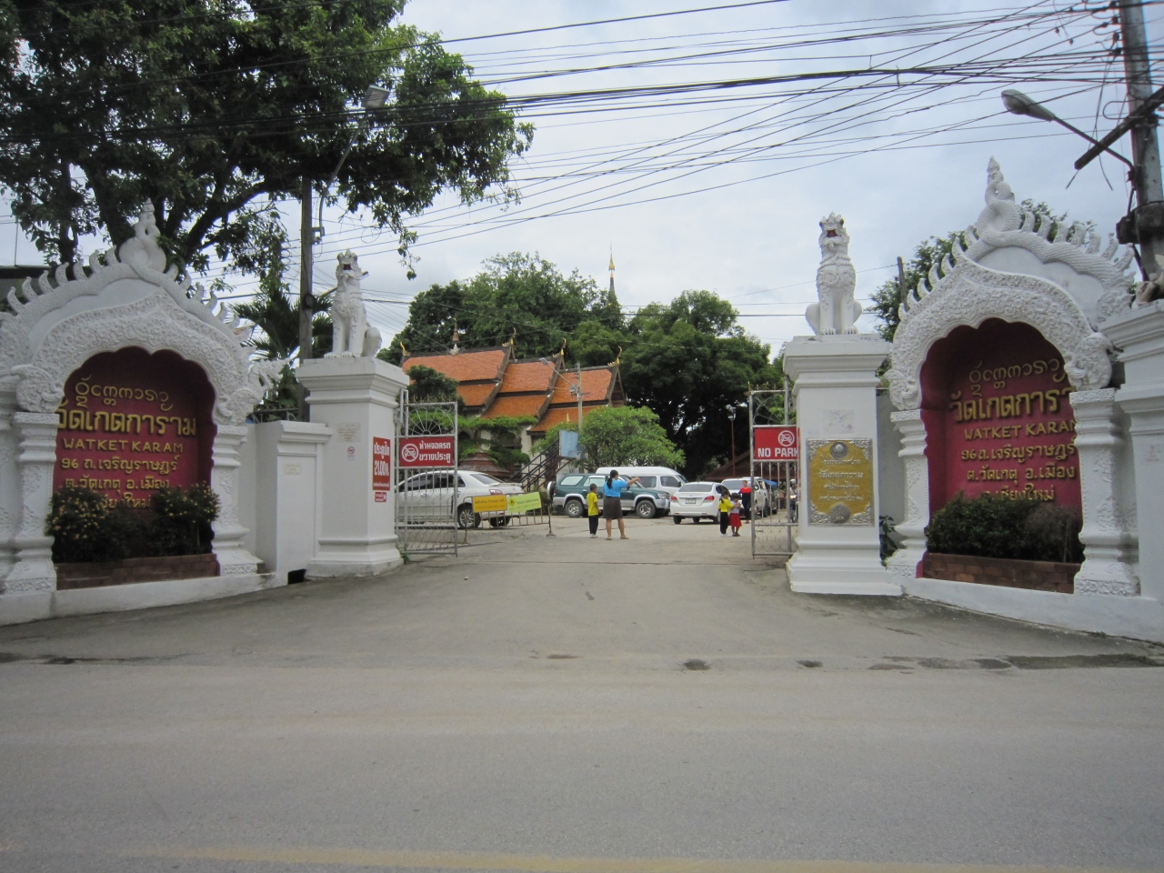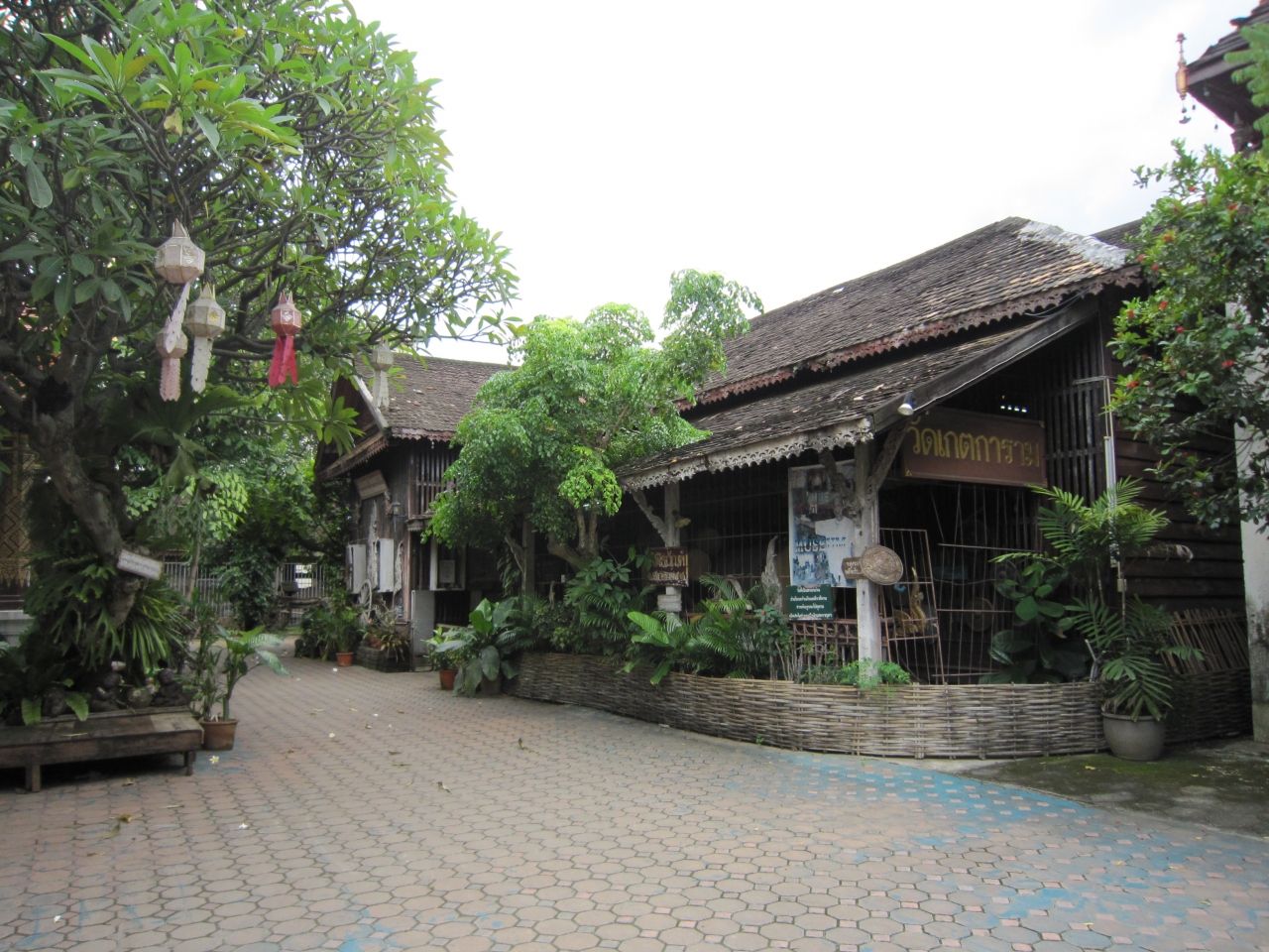 ワロロット市場からピン川の歩行者専用橋を渡り直ぐに行けます。裏門から入りますが裏門は2箇所あります。1箇所は歩行者用橋が再度建設された時に出来たようです。正門へは100m位境内を通ります。境内には本堂、礼拝堂、仏塔、博物館、学校等があります。正門から入ると両側に学校があり、休み時間のようで子供たちが遊んでいました。天国にあるお寺を模倣したので、仏塔はその天界にあるお寺を指さないよう少し傾いているそうです。分かりますか。お寺の干支は戌だそうで、犬の置物があります。本堂の裏の壁はガラスモザイクで花等の装飾が施されており煌びやかです。また、入場無料の博物館があり昔の庶民の暮らしが見られます。色々と見るのがあります。ワロロット市場から歩行者用橋を渡り近いですので是非一度訪れて下さい。