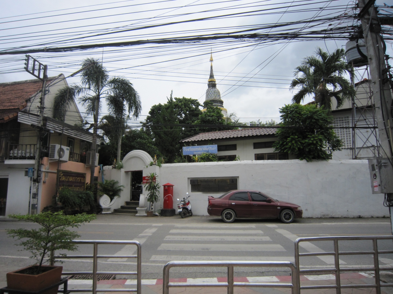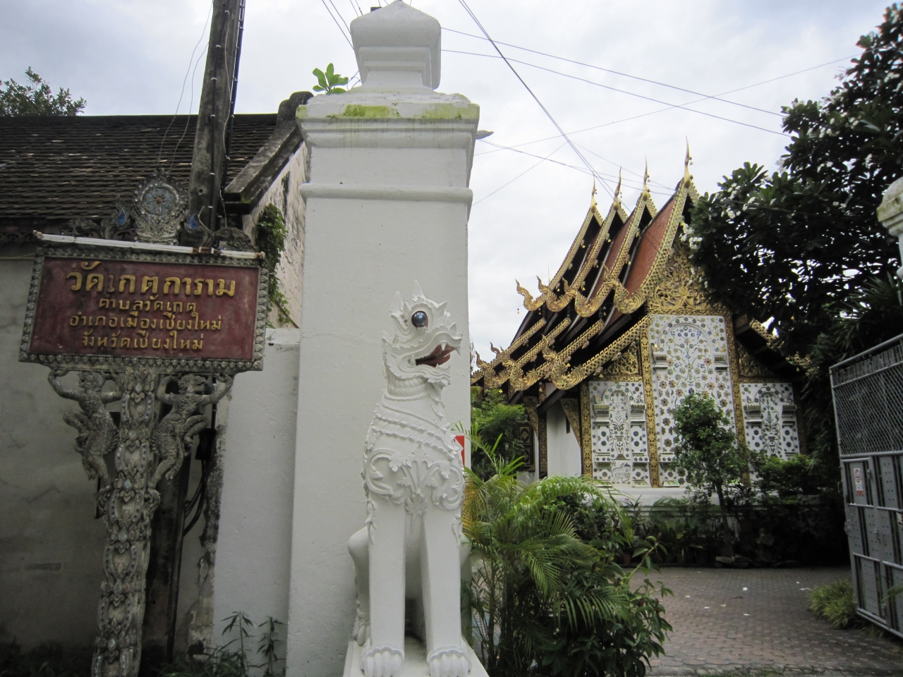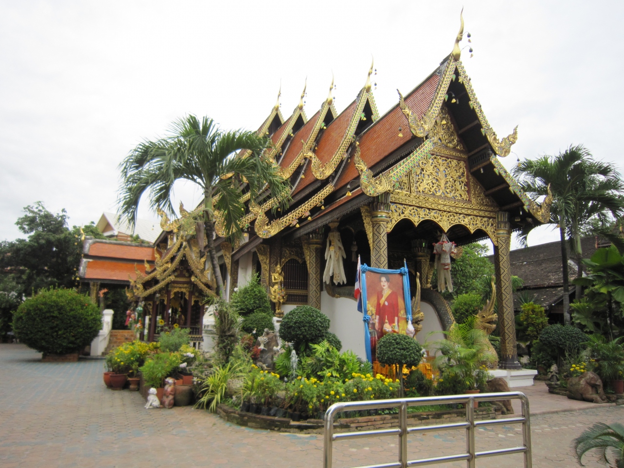 ワロロット市場からピン川の歩行者専用橋を渡り直ぐに行けます。裏門から入りますが裏門は2箇所あります。1箇所は歩行者用橋が再度建設された時に出来たようです。正門へは100m位境内を通ります。境内には本堂、礼拝堂、仏塔、博物館、学校等があります。正門から入ると両側に学校があり、休み時間のようで子供たちが遊んでいました。天国にあるお寺を模倣したので、仏塔はその天界にあるお寺を指さないよう少し傾いているそうです。分かりますか。お寺の干支は戌だそうで、犬の置物があります。本堂の裏の壁はガラスモザイクで花等の装飾が施されており煌びやかです。また、入場無料の博物館があり昔の庶民の暮らしが見られます。色々と見るのがあります。ワロロット市場から歩行者用橋を渡り近いですので是非一度訪れて下さい。