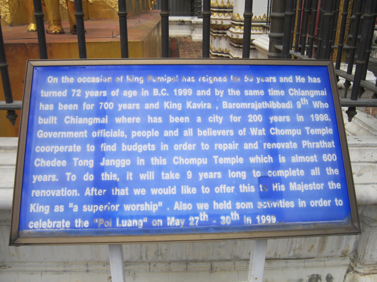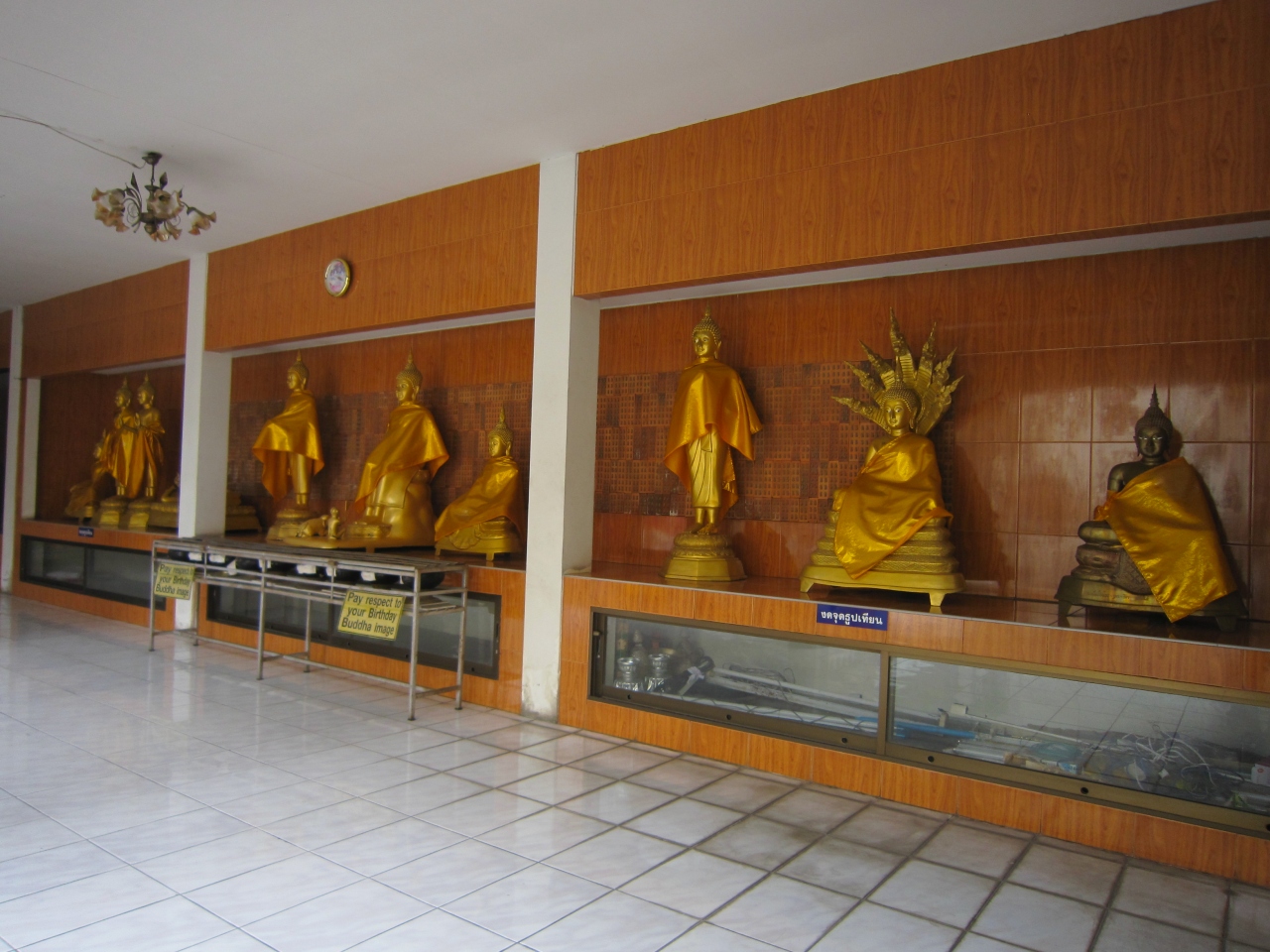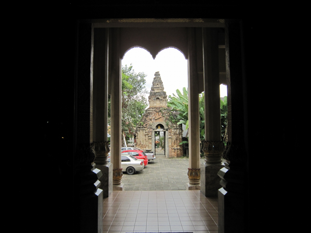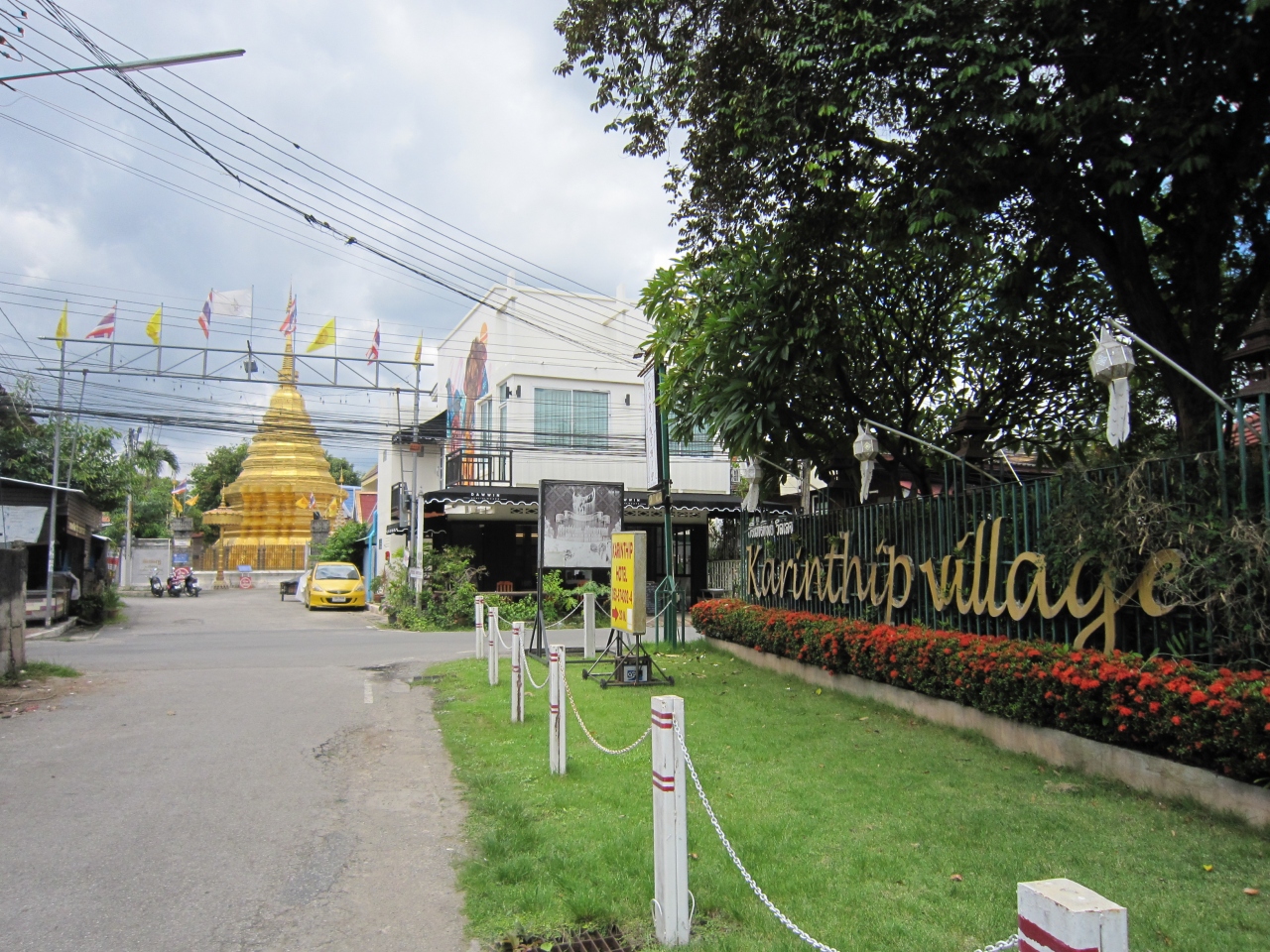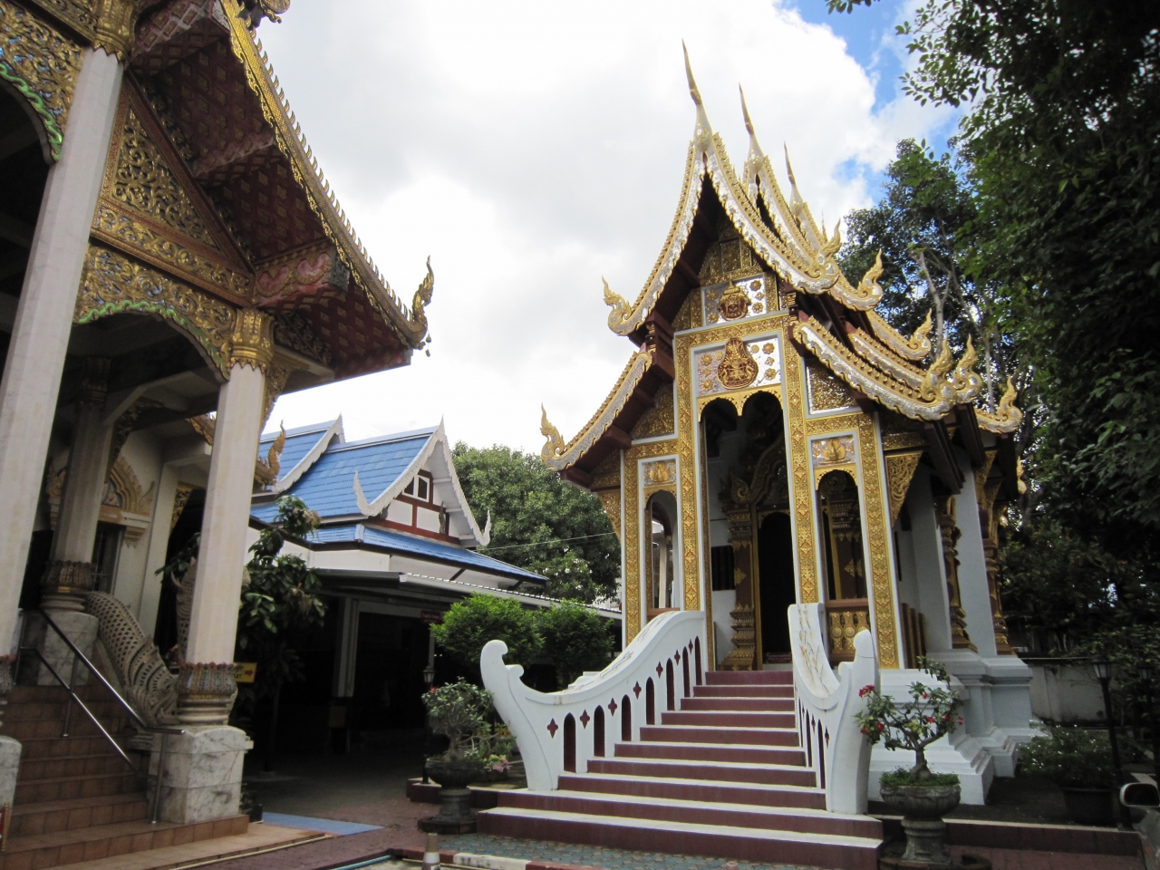 お堀の通りからチャイモン通りに入り最初の細道を左折し直ぐです。住宅地の中にあります。道路から金色の仏塔が見えます。晴れていたので非常に光り輝いていました。由緒あるお寺で20年近く前に修理修繕したとの説明板がありました。仏塔の右側に礼拝堂、礼拝堂正面に向かって右側には新しく出来たお堂、ナーガがまだ出来ていないようで寄付を募る幕が張っていました。礼拝堂の中には入れました。また礼拝堂の前には古い石の門がありました。正門のようですが狭い入口です。数人観光客が訪れていました。普段は静かなお寺のようです。