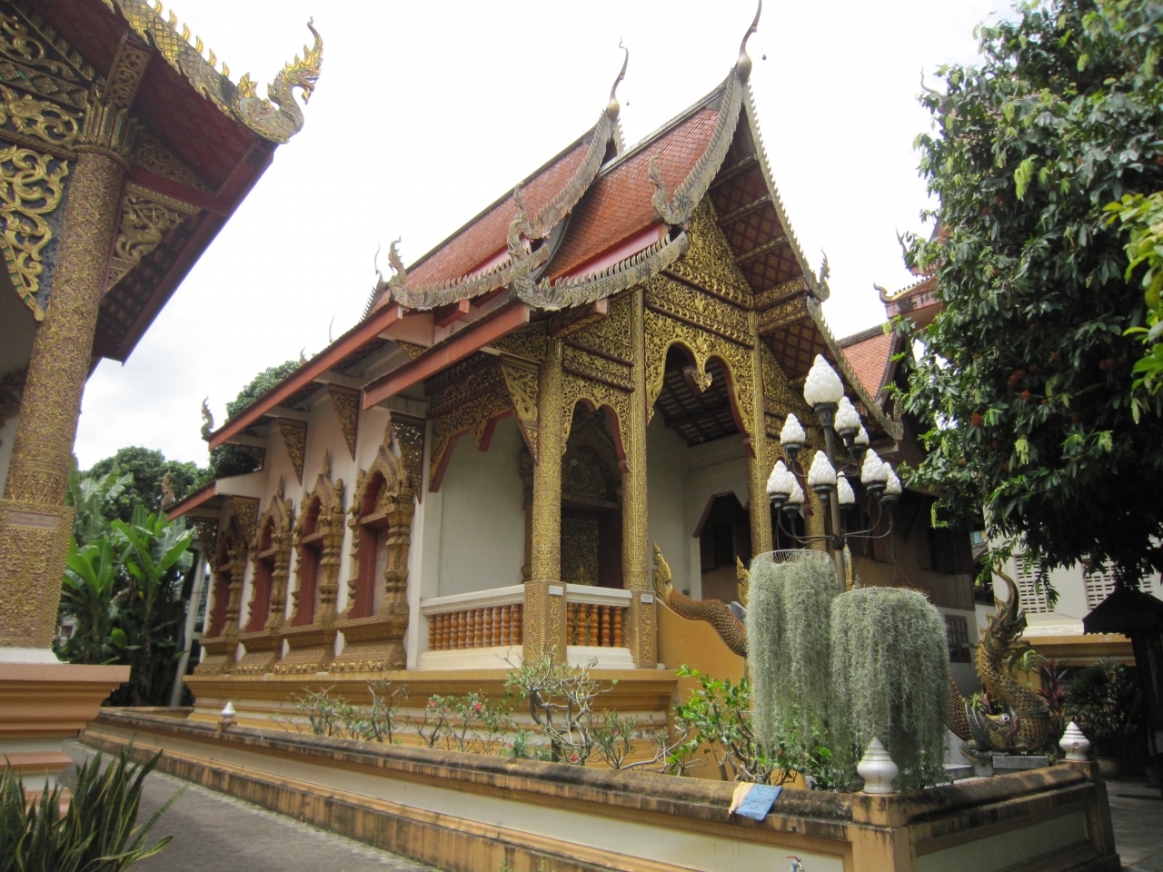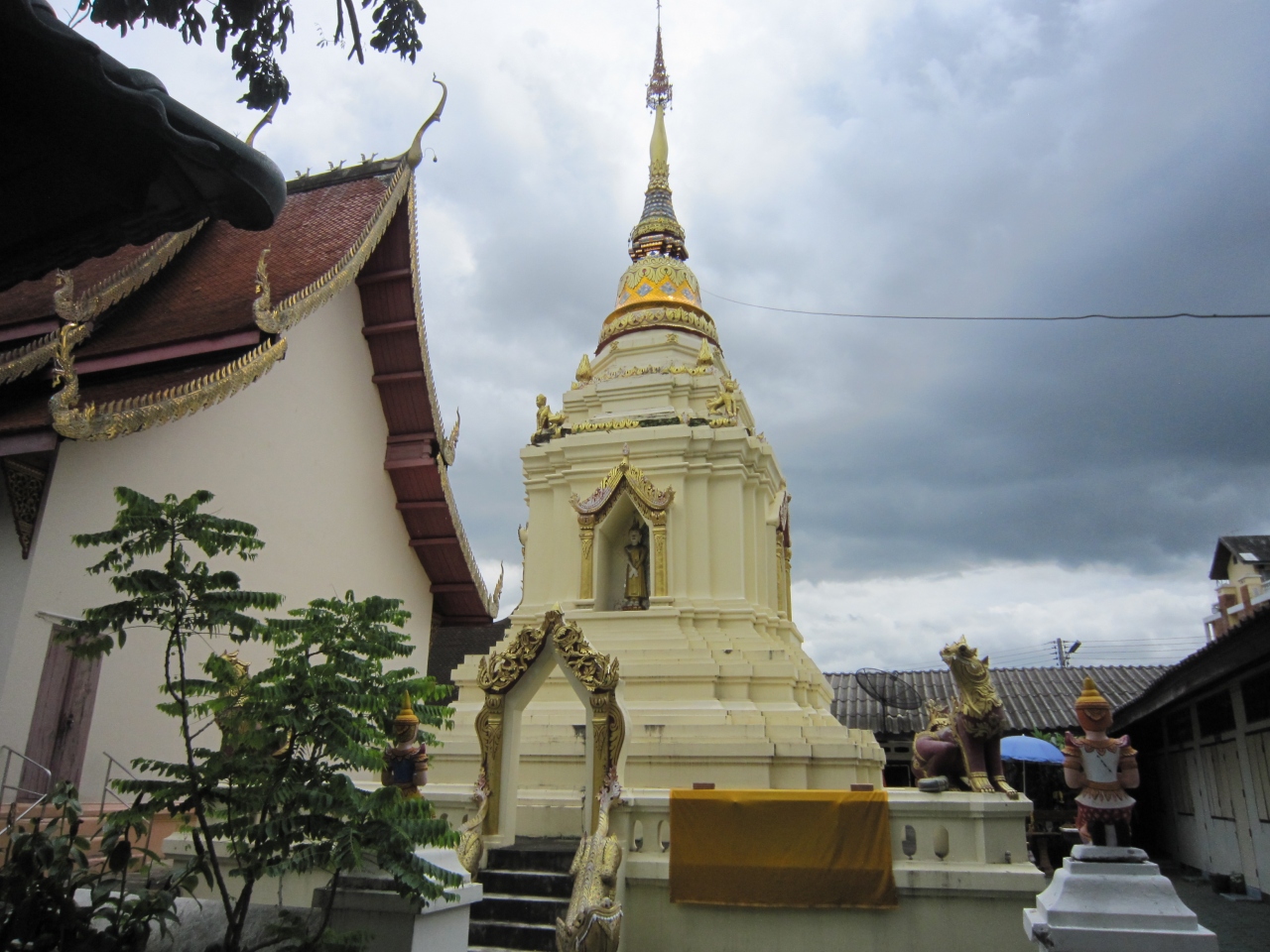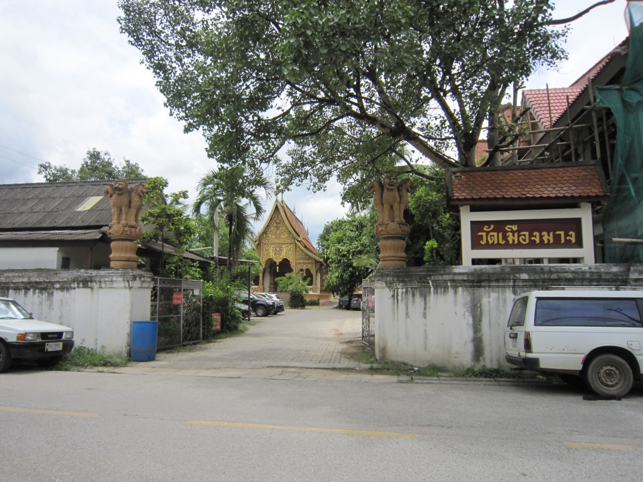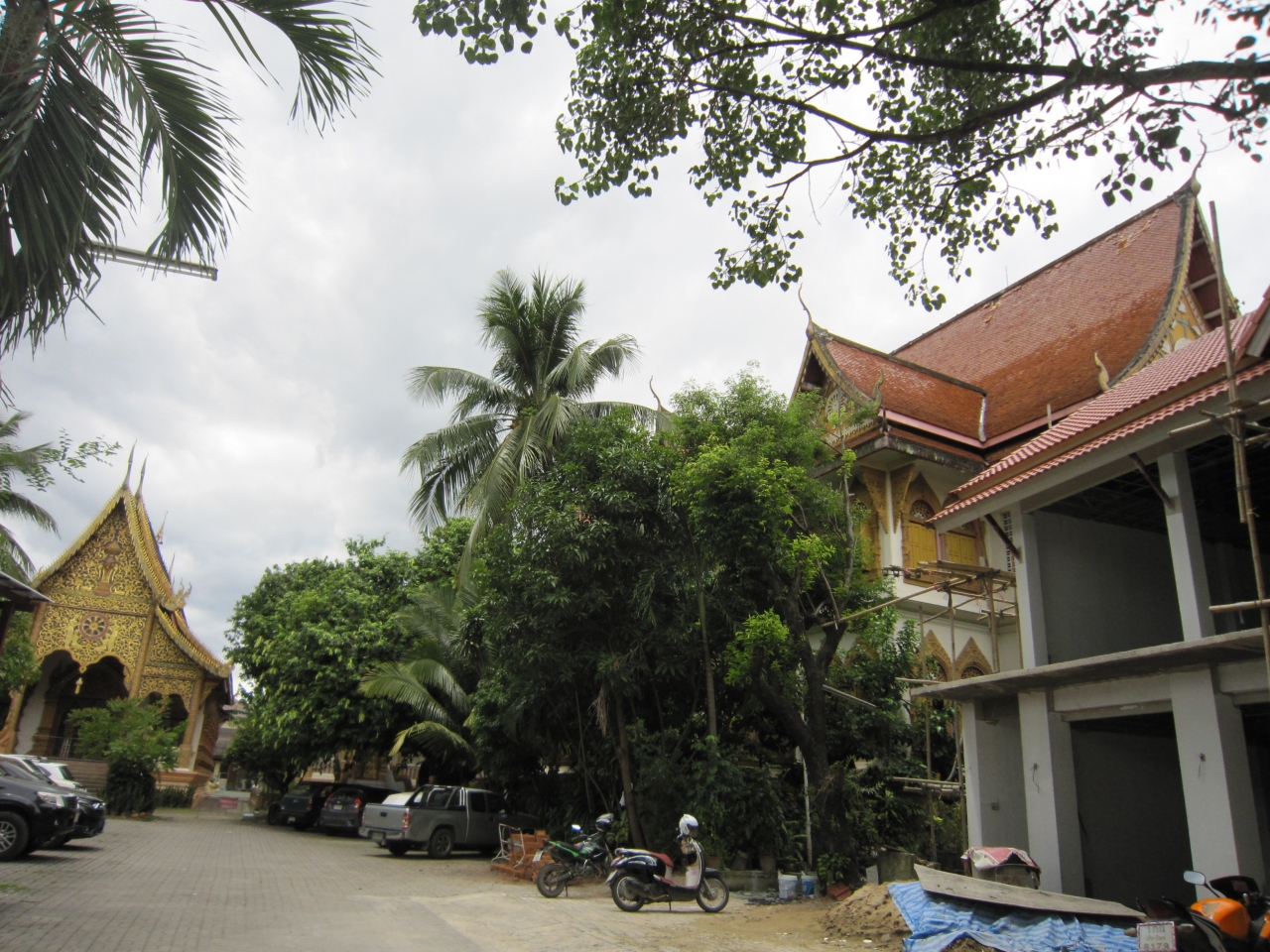 ナイトバザール通り南のパンティッププラザを右折、スリドンチャイ通りを真っ直ぐ行き、南東カダムコーナーをそのまま直進、ガソリンスタンドの先で細道を左折、お寺名の表示板があり100mとあります。正門を入ると正面に大きな金色の礼拝堂と本堂どちらか分かりませんが並んで建っていました。樹木が多く正面から分かり難いです。右側は修行の建物でしょうか、樹木で茂っている先にあり、また新築工事中の建物もありました。左側の塀寄りには僧侶の居住施設、お堂の裏にはクリーム色の仏塔があり、仏塔の中に金色の仏像、周りに小さな仏像ありました。僧侶の居住施設も左側お堂横から続いて建っていました。観光客はおらず緑が多く静かなお寺でした。