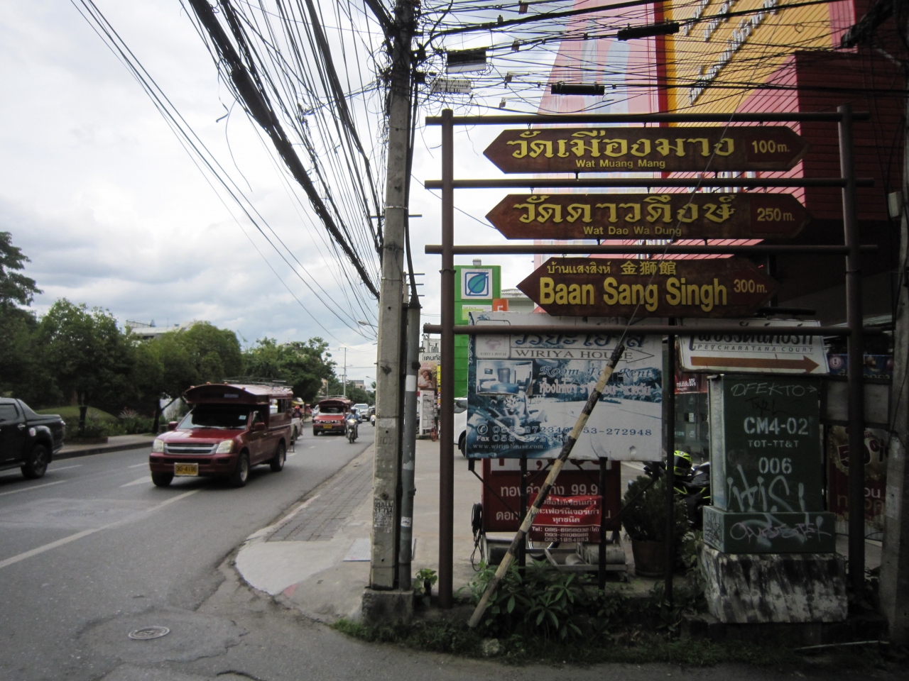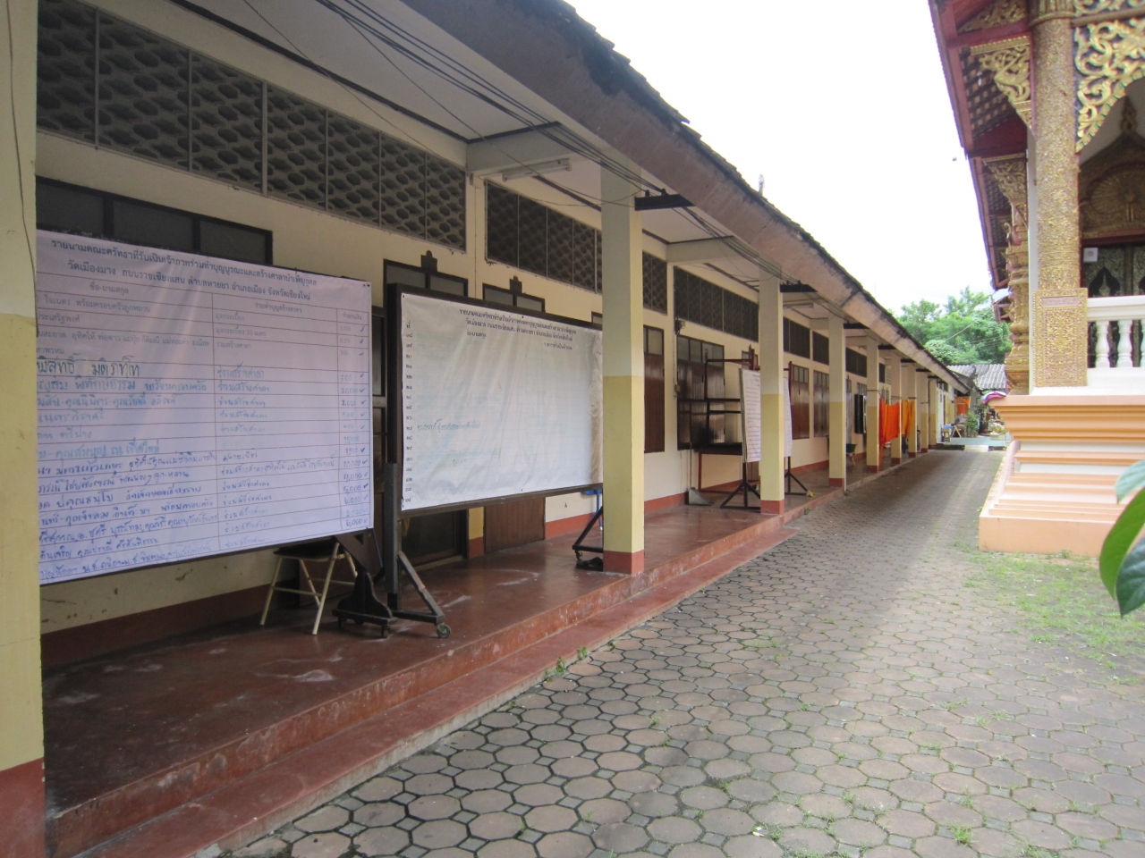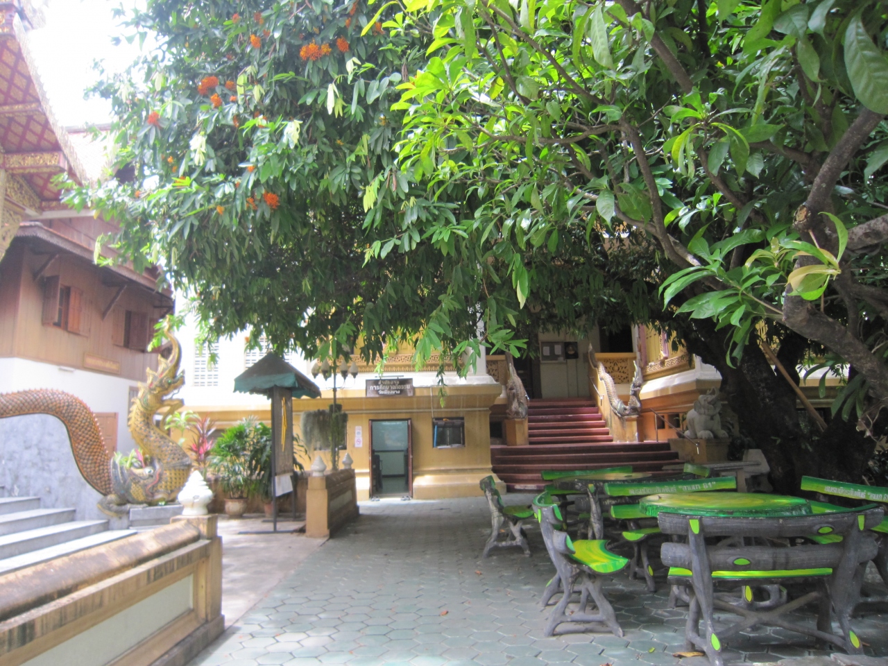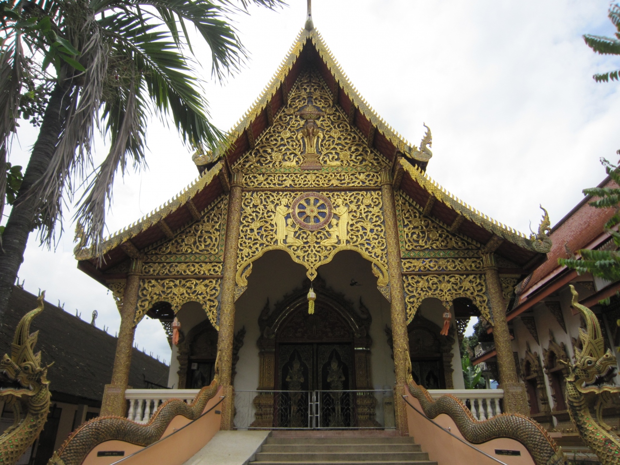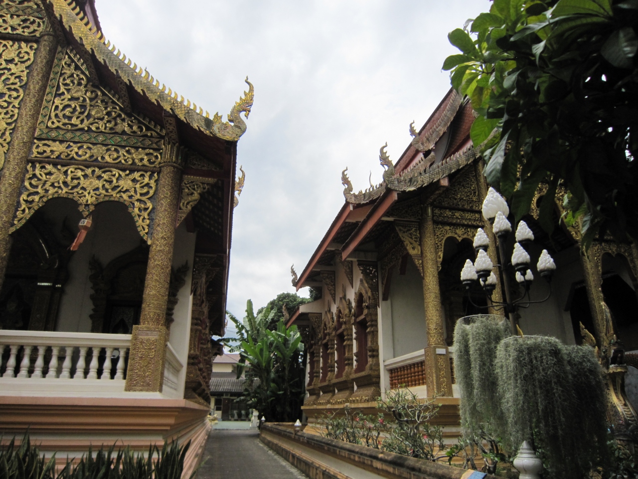 ナイトバザール通り南のパンティッププラザを右折、スリドンチャイ通りを真っ直ぐ行き、南東カダムコーナーをそのまま直進、ガソリンスタンドの先で細道を左折、お寺名の表示板があり100mとあります。正門を入ると正面に大きな金色の礼拝堂と本堂どちらか分かりませんが並んで建っていました。樹木が多く正面から分かり難いです。右側は修行の建物でしょうか、樹木で茂っている先にあり、また新築工事中の建物もありました。左側の塀寄りには僧侶の居住施設、お堂の裏にはクリーム色の仏塔があり、仏塔の中に金色の仏像、周りに小さな仏像ありました。僧侶の居住施設も左側お堂横から続いて建っていました。観光客はおらず緑が多く静かなお寺でした。