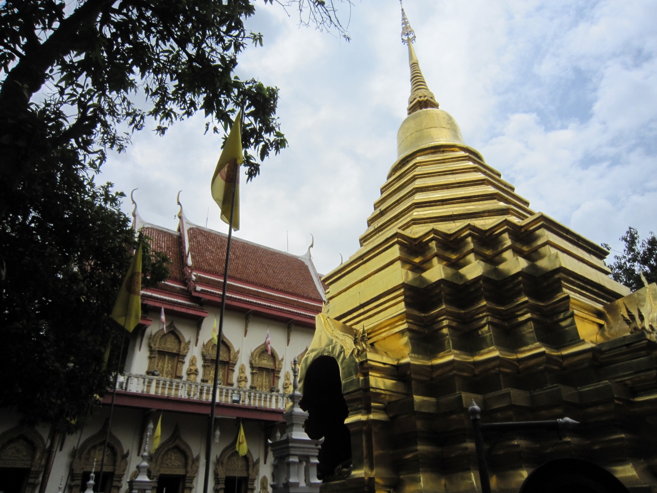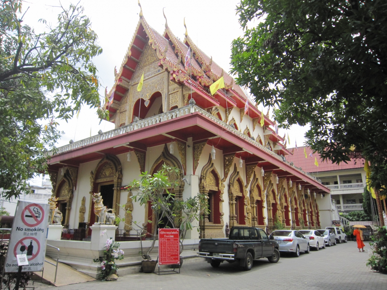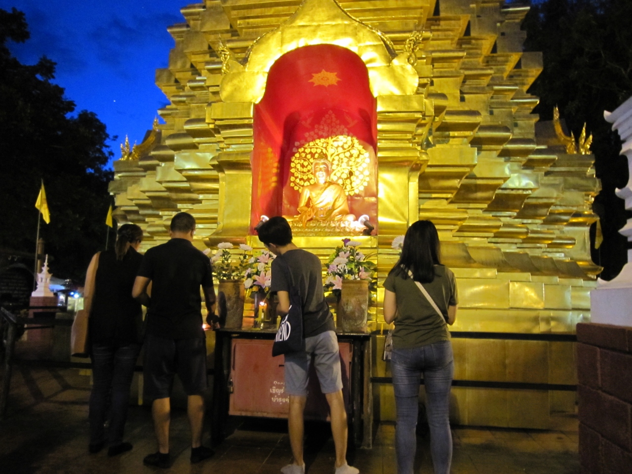 ターペー門からサンデーマーケット道路をワット・プラシン方面へ300m左側、道路側入口は2箇所あり手前の入口から入ると左側に美しく豪華絢爛な礼拝堂、仏像も華やいでいます。礼拝堂の右側には金ピカの大きな仏塔があります。ラーンナー王朝のケーオ王の時期の1501年に建設と説明板にあり、絶え間なく参拝者がいました。街の中のため観光客が多かったです。この寺には売店や広い休憩所があり、サンデーマーケットの時は露店が多く出て、仏塔をライトアップして大変賑わいます。休憩し飲食するには絶好の場所でした。