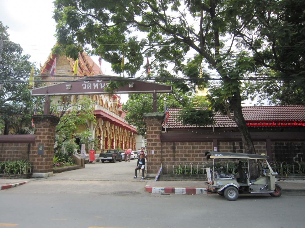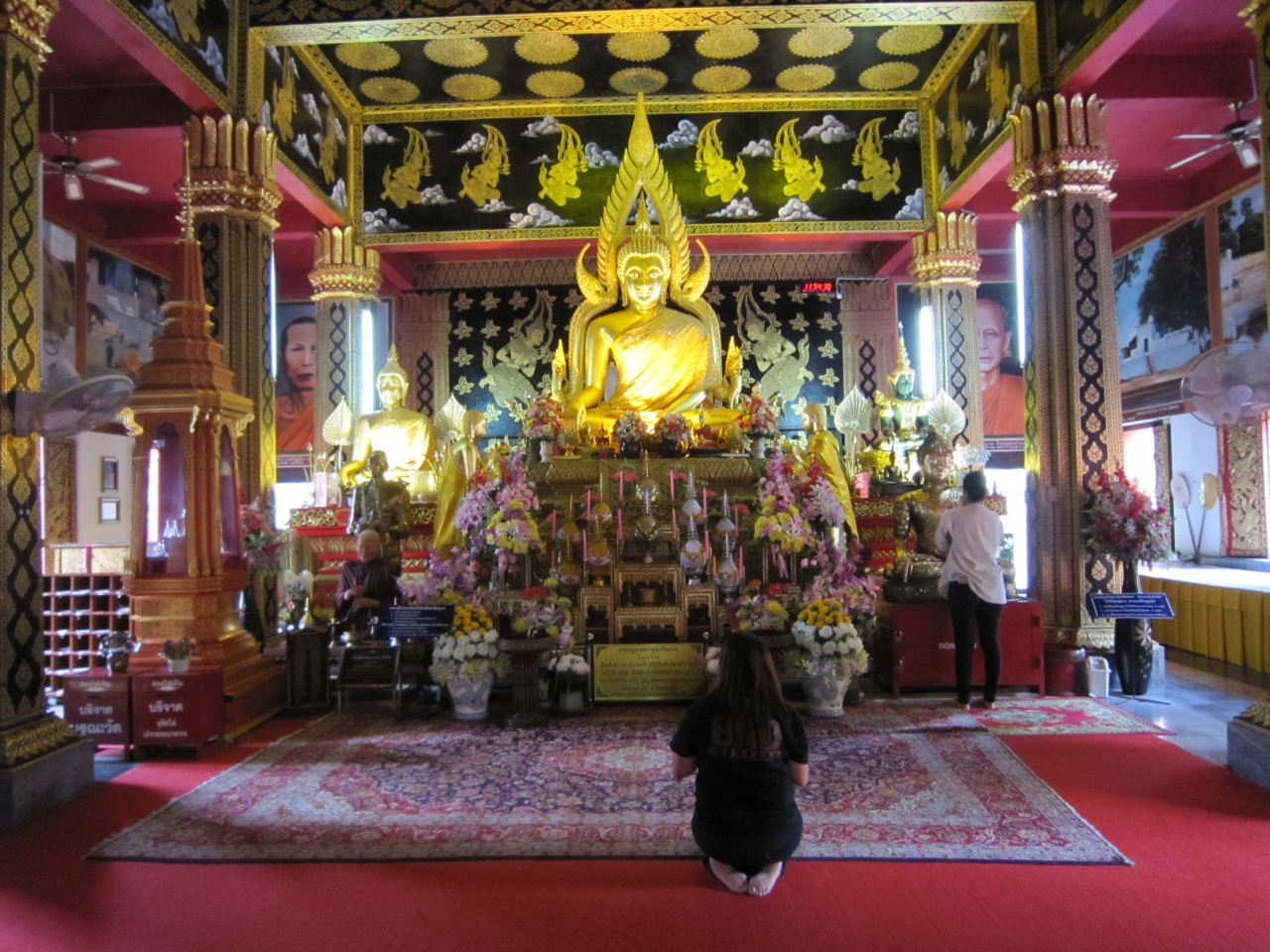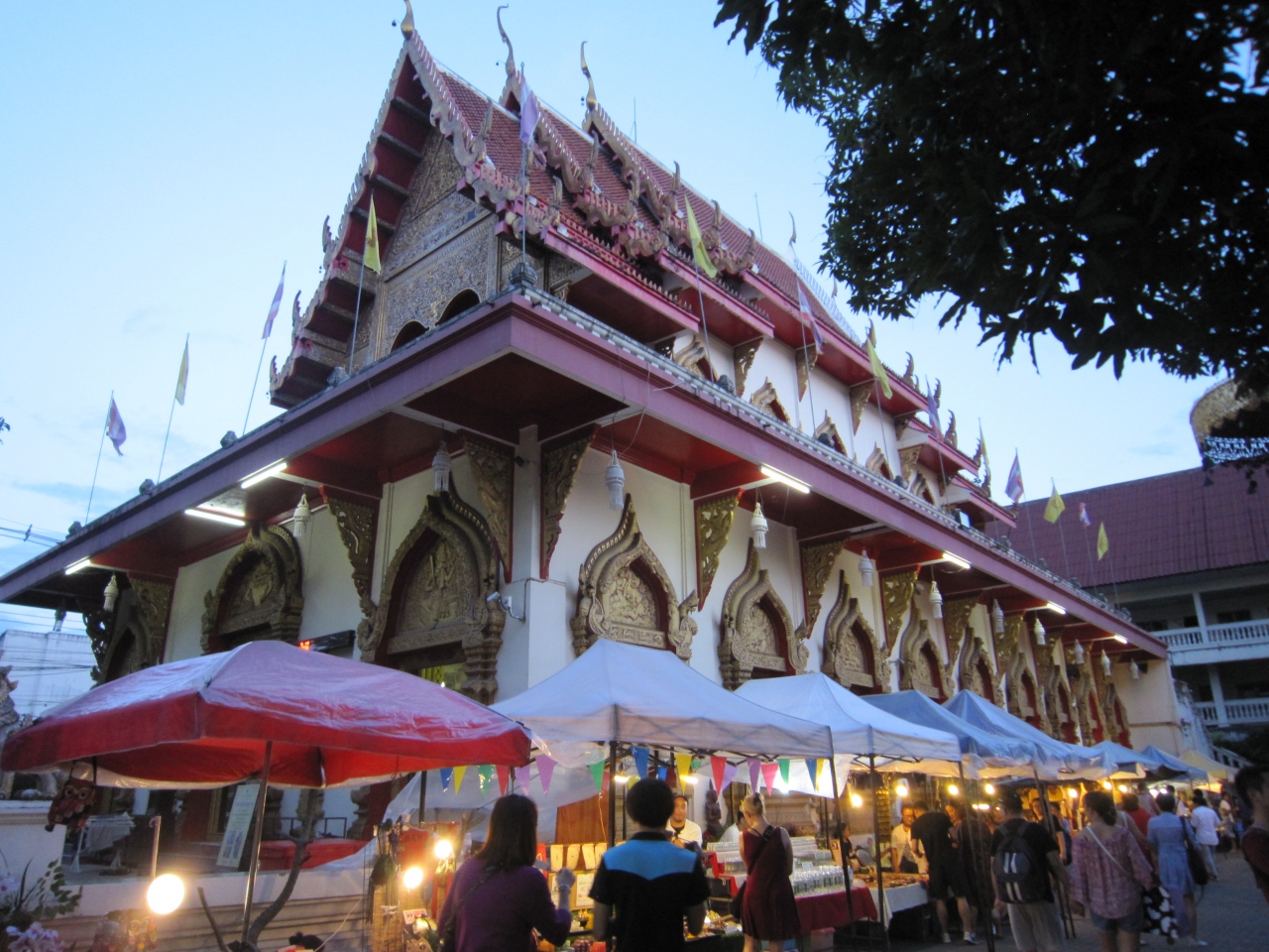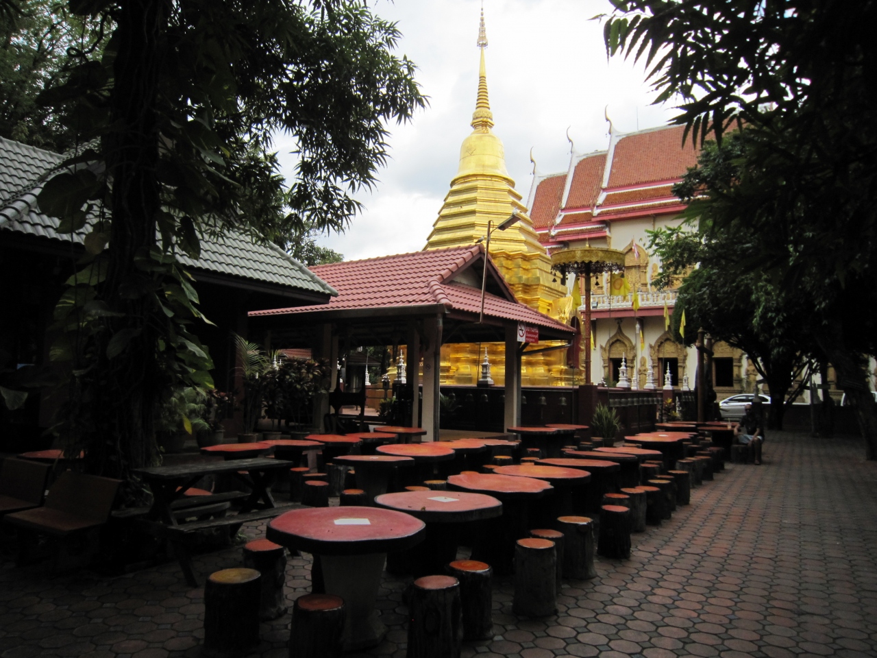 ターペー門からサンデーマーケット道路をワット・プラシン方面へ300m左側、道路側入口は2箇所あり手前の入口から入ると左側に美しく豪華絢爛な礼拝堂、仏像も華やいでいます。礼拝堂の右側には金ピカの大きな仏塔があります。ラーンナー王朝のケーオ王の時期の1501年に建設と説明板にあり、絶え間なく参拝者がいました。街の中のため観光客が多かったです。この寺には売店や広い休憩所があり、サンデーマーケットの時は露店が多く出て、仏塔をライトアップして大変賑わいます。休憩し飲食するには絶好の場所でした。