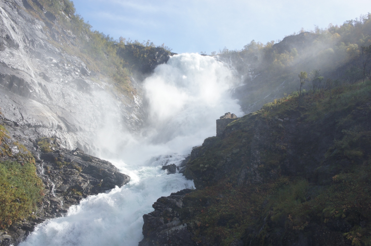ミュールダールの駅ではフロム鉄道に乗り換える人でいっぱいでした。赤いベルゲン鉄道から緑色のフロム鉄道に乗り換えました。866メートルのミュールダールから海抜2メートルのフロムまでゆっくりと下りていきます。途中ショースの滝では5分間ぐらいの撮影タイムで列車が止まってくれます。