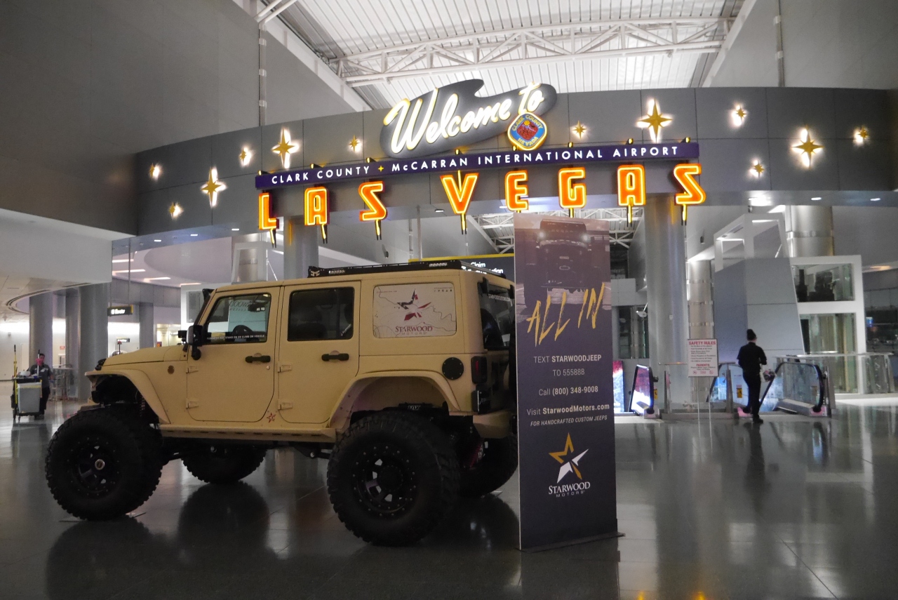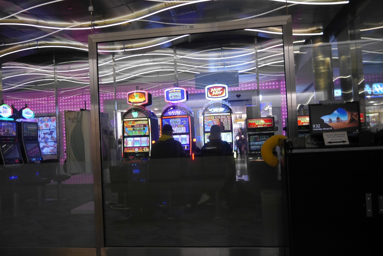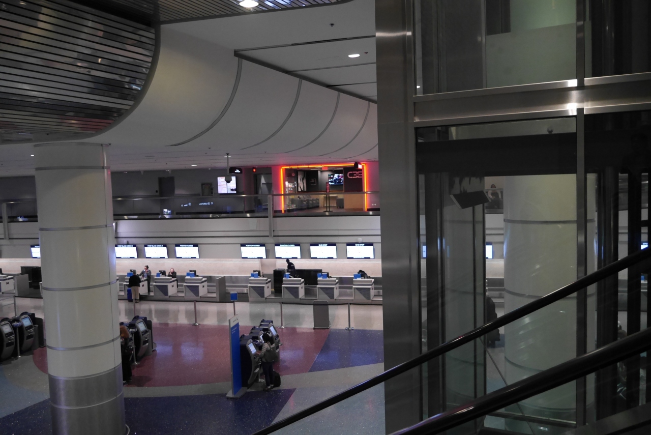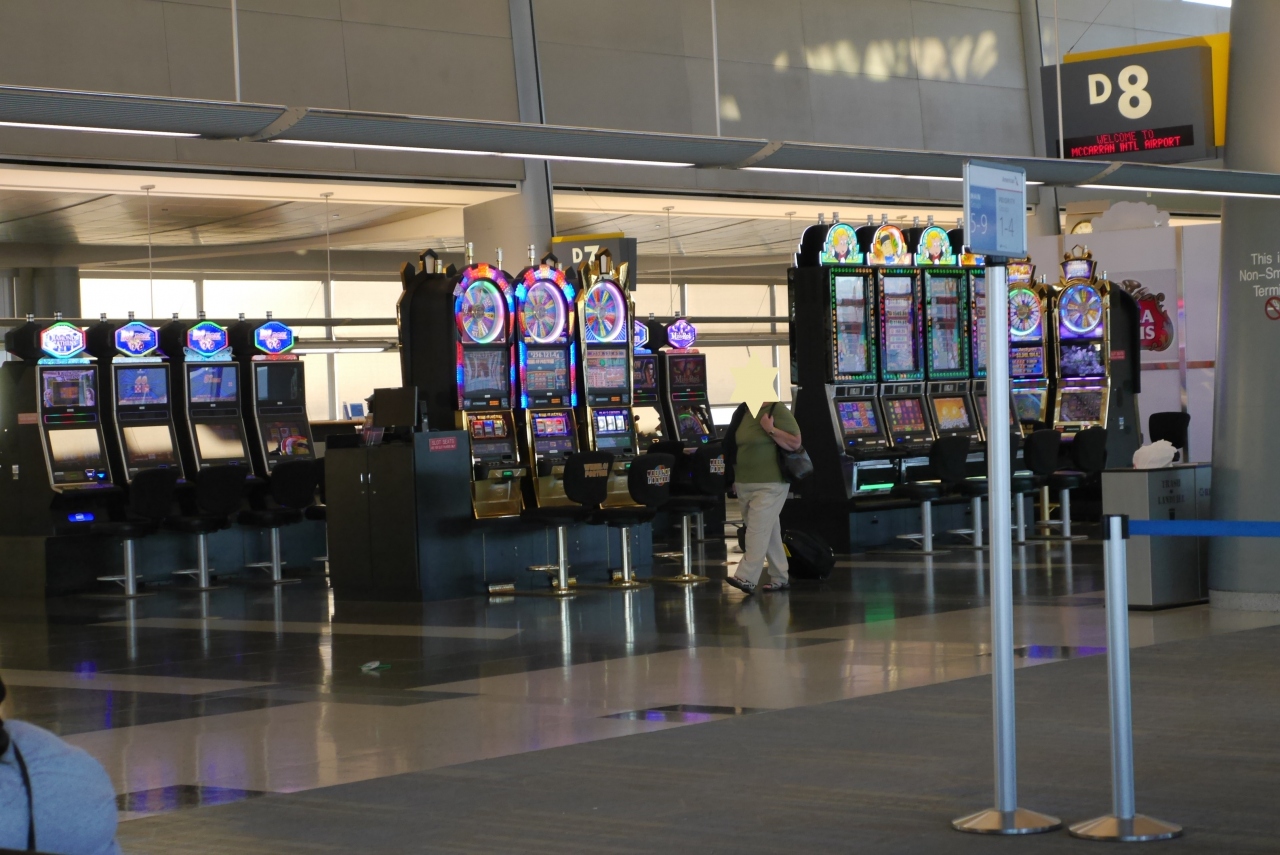市街地にある空港ですが、ストリップからは10分ほどかかります。チェックインしてからターミナル移動するので、時間には余裕を持っていかないといけません。早めにゲート付近まで行くとスロットマシンが並んだ待合室があり、窓からはラスベガスを囲む山並みが見渡せました。