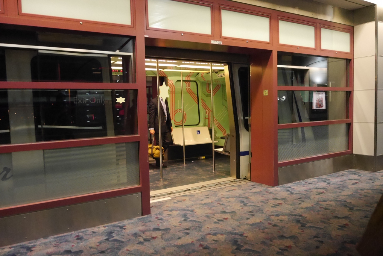 ラスベガスの国際空港で、到着ゲートを出るとスロットマシンが並んでいます。空港内は禁煙ですが、ガラスで仕切られたスロットマシンコーナーがあり、ここだけは喫煙可能になっていました。ラスベガスマークを過ぎ、列車でバゲージクレームに向かいます。車内のシートにはホテルの宣伝も入っていました。