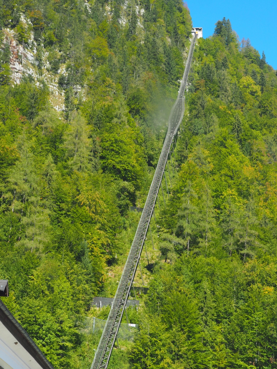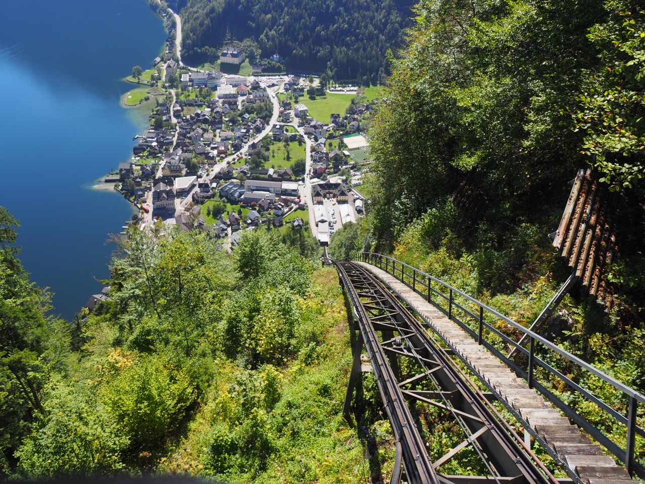 ハルシュタットの人気アクティビティに岩塩坑がありますが、長くてスピードの出る滑り台などどちらかと言えば若者向け。しかし、岩塩坑に行かなくてもケーブルカーに乗る価値は十分あります。それがこの展望橋。