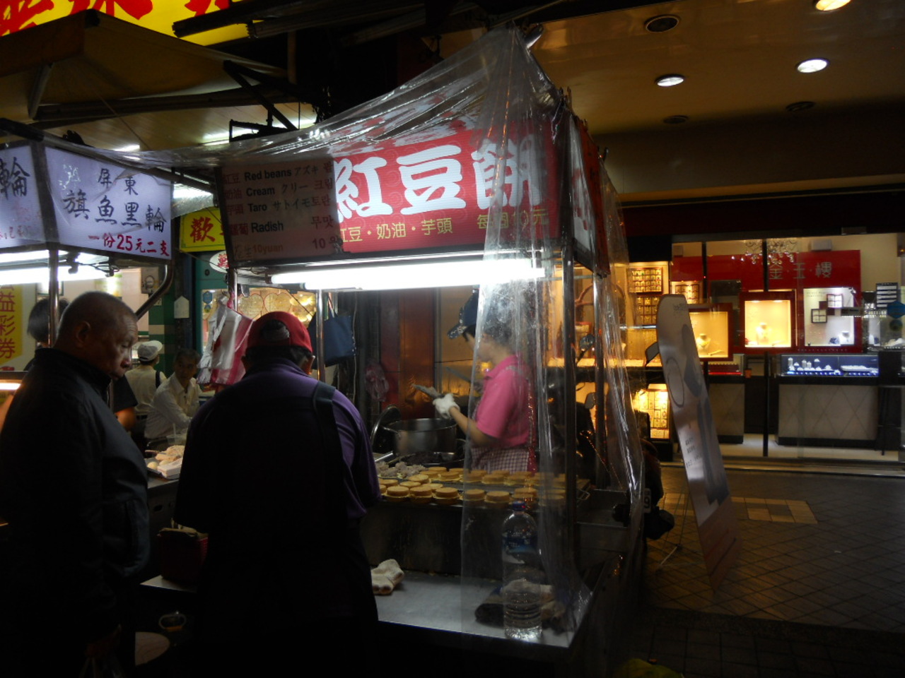 龍山寺の前を通っている廣州街にて開催されている夜市です。龍山寺が近いこともあるからか、多くの人で賑わっていました。食べ物の屋台も多かったですが、服や帽子を売っているお店なども出ていました。小腹が空いていたので、手軽に食べられそうな大判焼きのようなものを買いました。