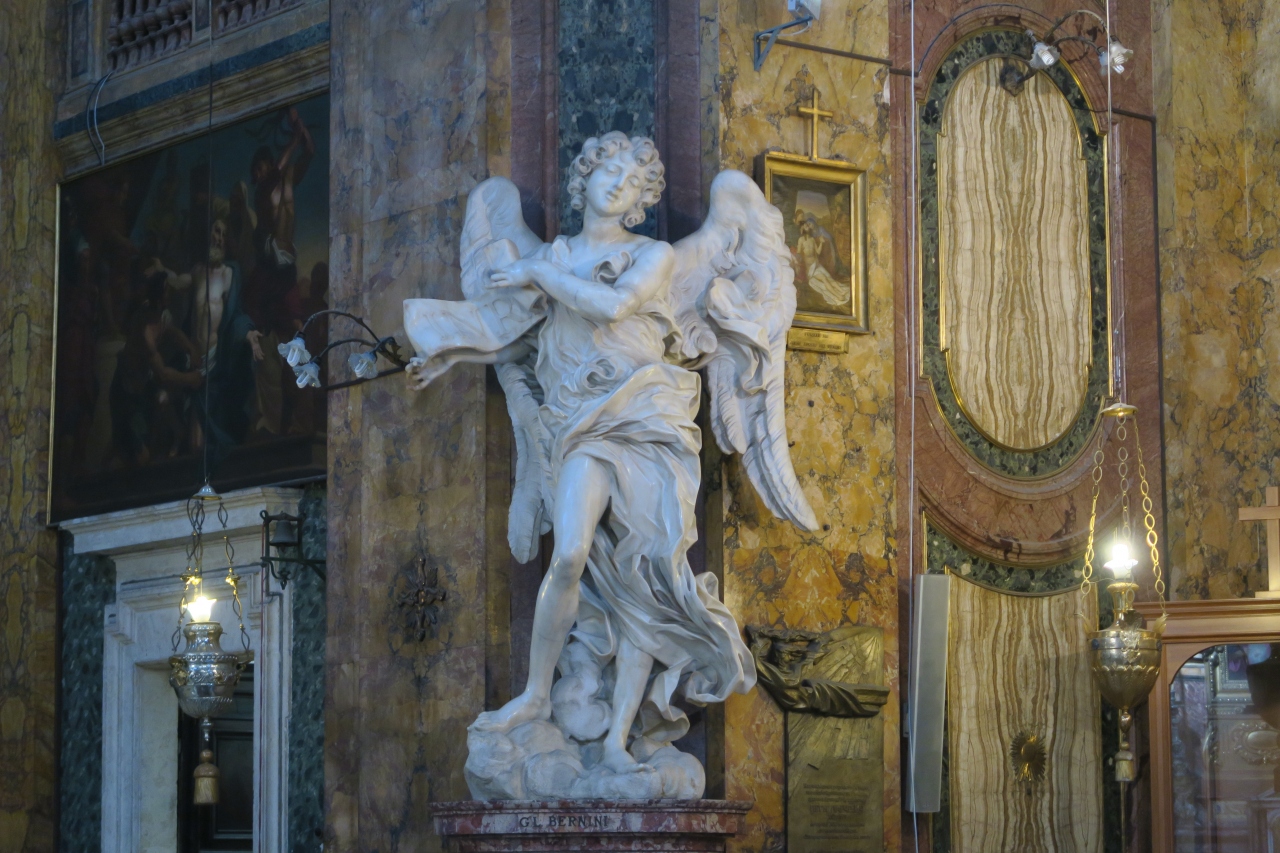 教会の中に入って見て、すごく不思議だなと思ったのは、ベルニーニの天使像は東側にある主祭壇の両側にあって、主祭壇から少し外れた場所で、手前にある祭壇は北側を向いていたことです。