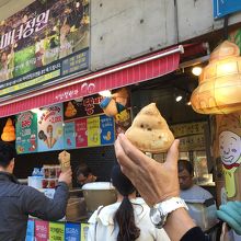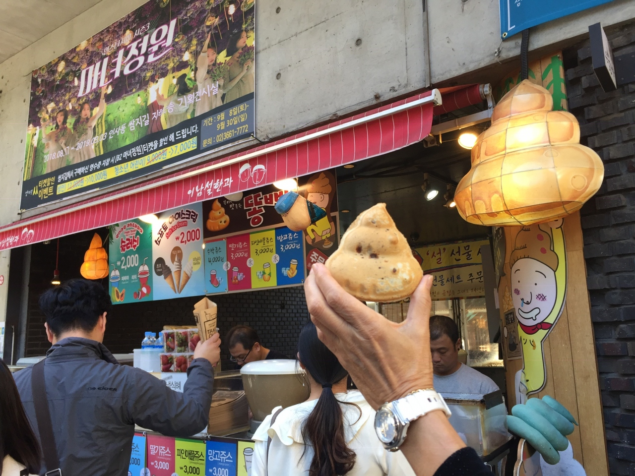 店舗は通り抜けになっています。サムジキルとは反対側(裏側)から見て、ひときわにぎわっていたお店に入ってみました。表側から見ると、なんと、かの有名な「うんこパン」のお店でした。5分待って焼き立てアツアツをいただきました。1個百円くらいで、こんなにテンション上がって笑って美味しくて、幸せなひと時でした。