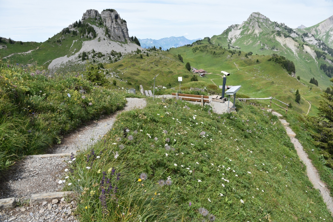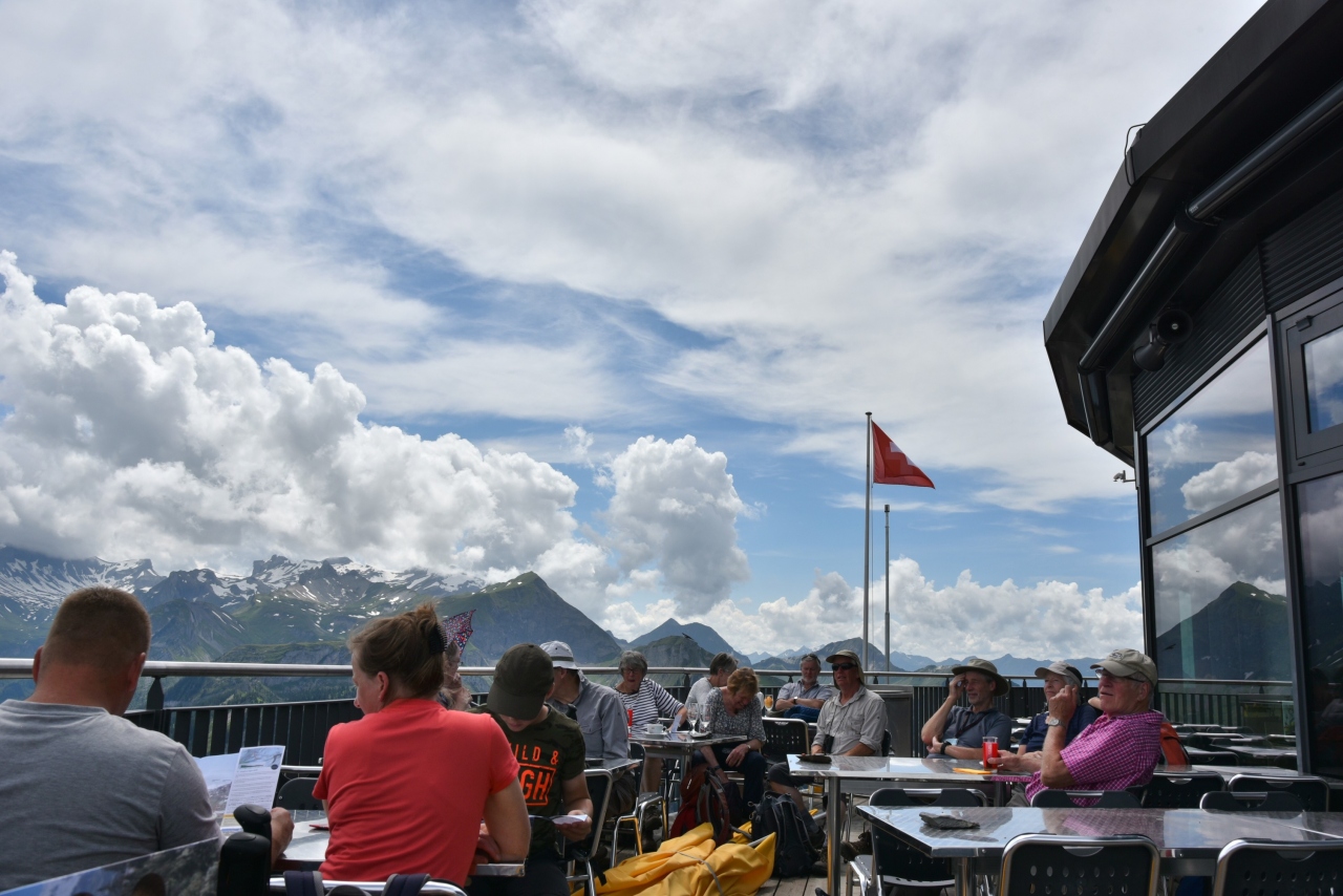 ヴィルダースヴィル駅から古めかしい電車に乗って山に登ります。車窓の景色は良いです。シーニゲプラッテ駅に到着して左手のホテルシーニゲプラッテでアルプスの景色を見ながらお茶しました。その後駅方向へ戻りそのままホ-ムを直進して高山植物園へ行きました。