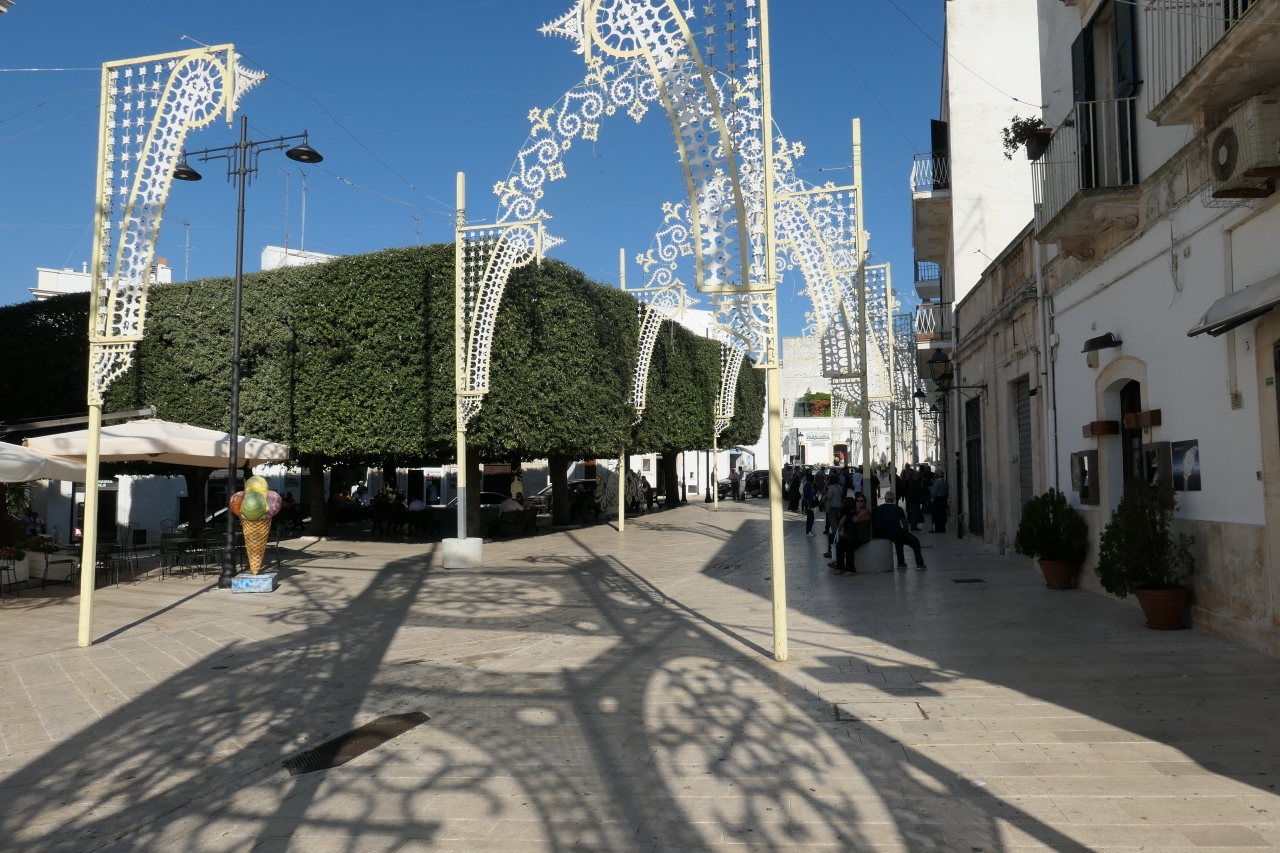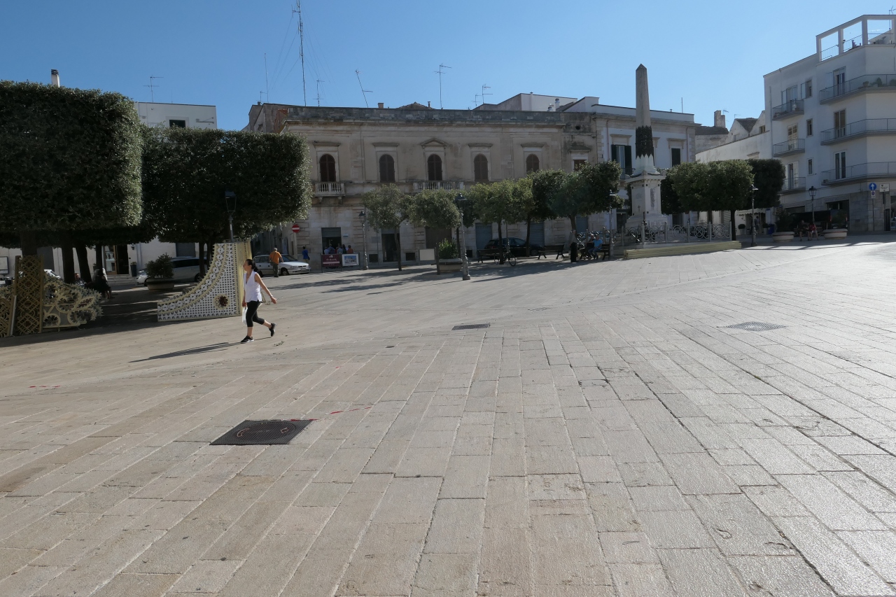 アルベロベッロの中心部にある広場がポポロ広場で、市庁舎もここにあります。手入のされた植え込み、小さな噴水、そしてオベリスクもある広場で、木陰で年配の方が新聞を読んだり談笑されていました。セミナリオもあり夕方から夜にかけてライトアップされるようです。訪問したのは朝でしたので、見事な照明は見れませんでした。