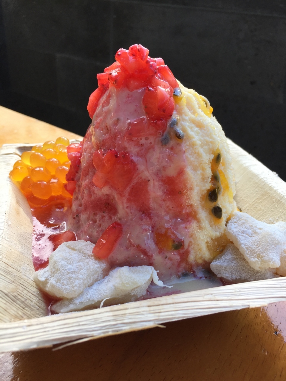 シロップもジューシーでフルーティー、ストロベリーとリリコイソースの下にはヨーグルトフローズンも隠れていてとても創作的なスイーツです。タピオカやお餅も添えられていて色々な食感も楽しめます。