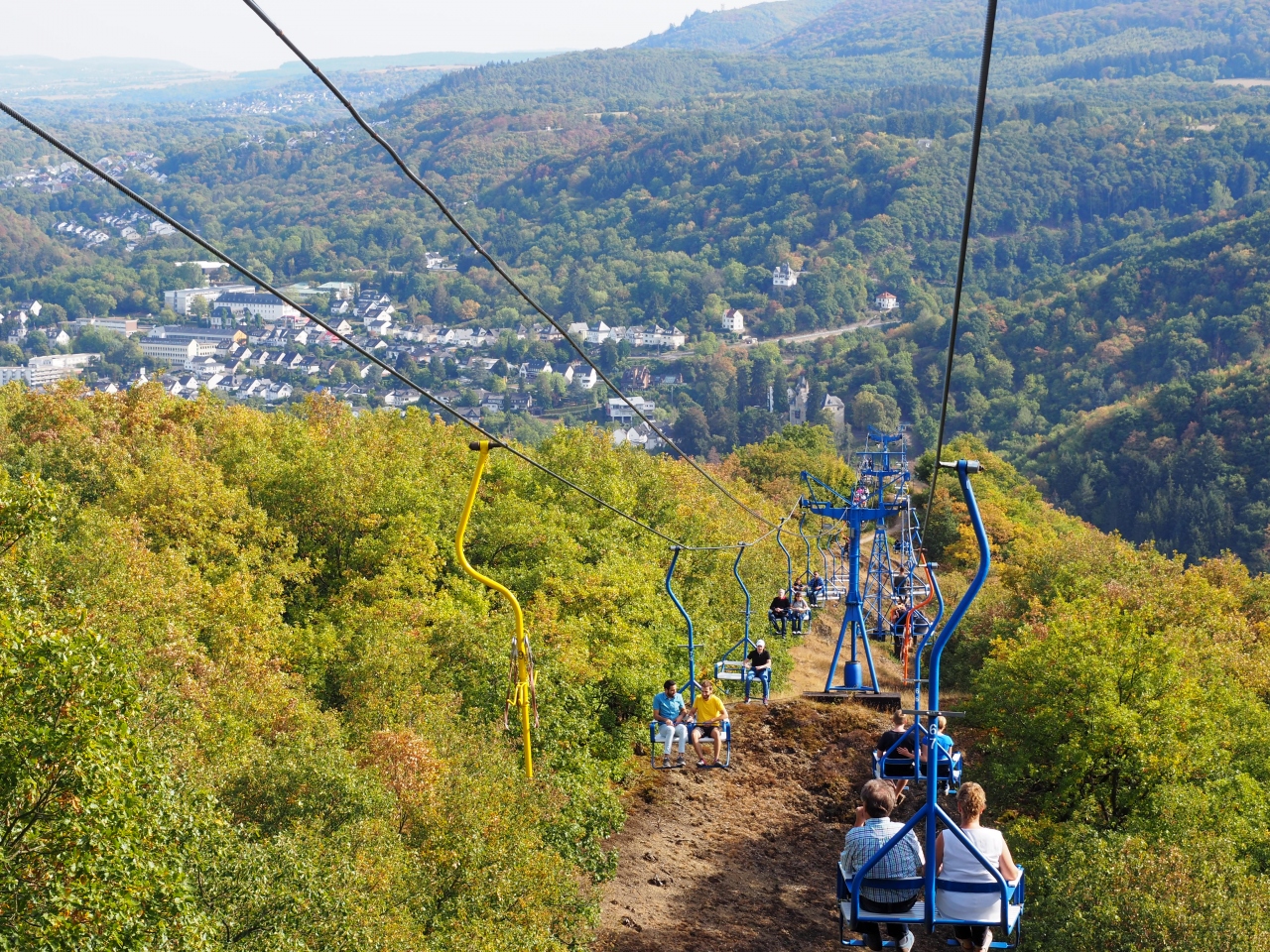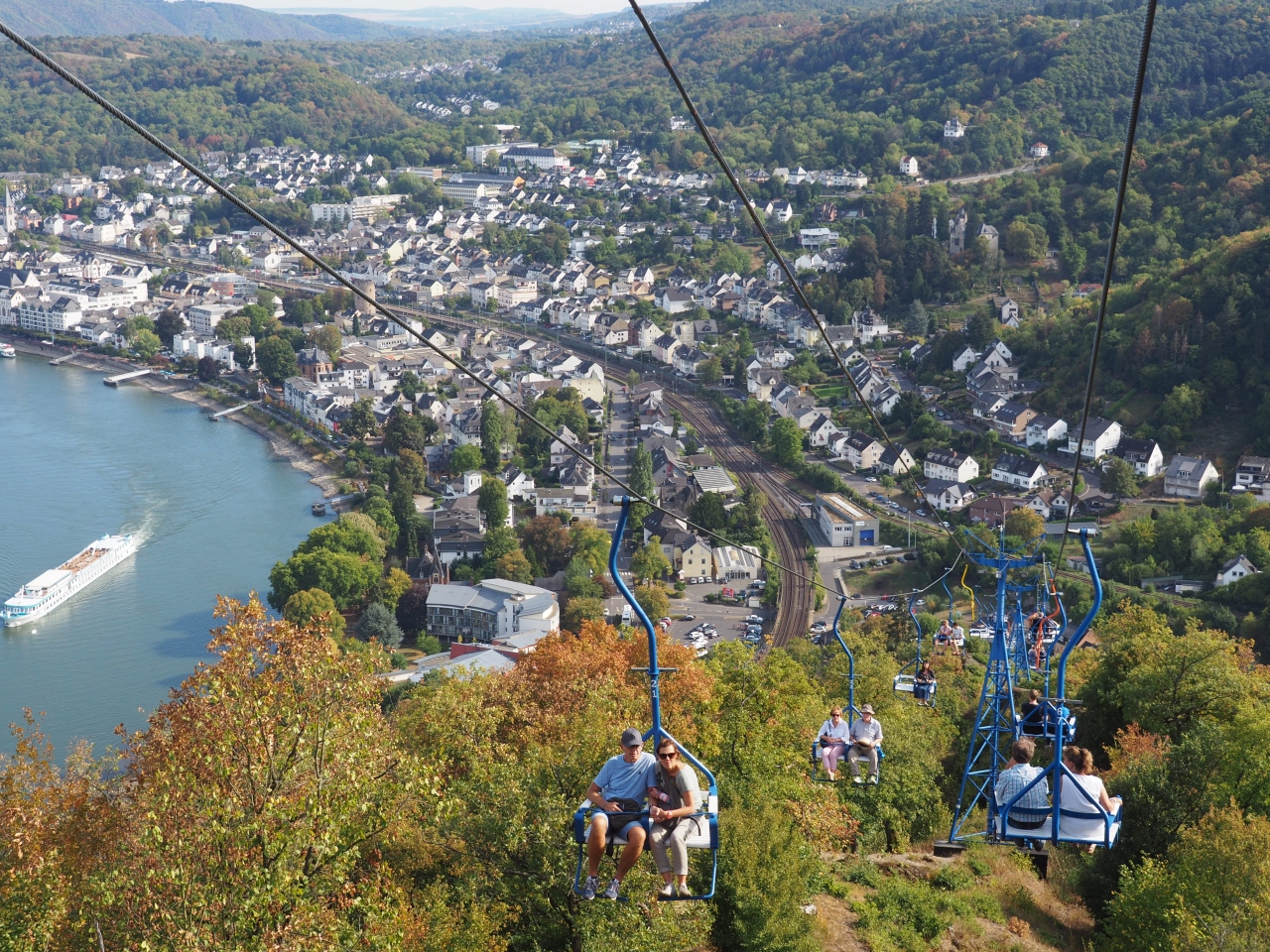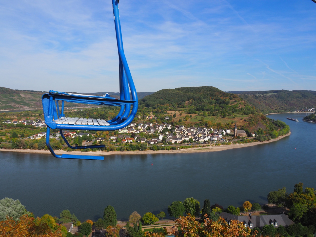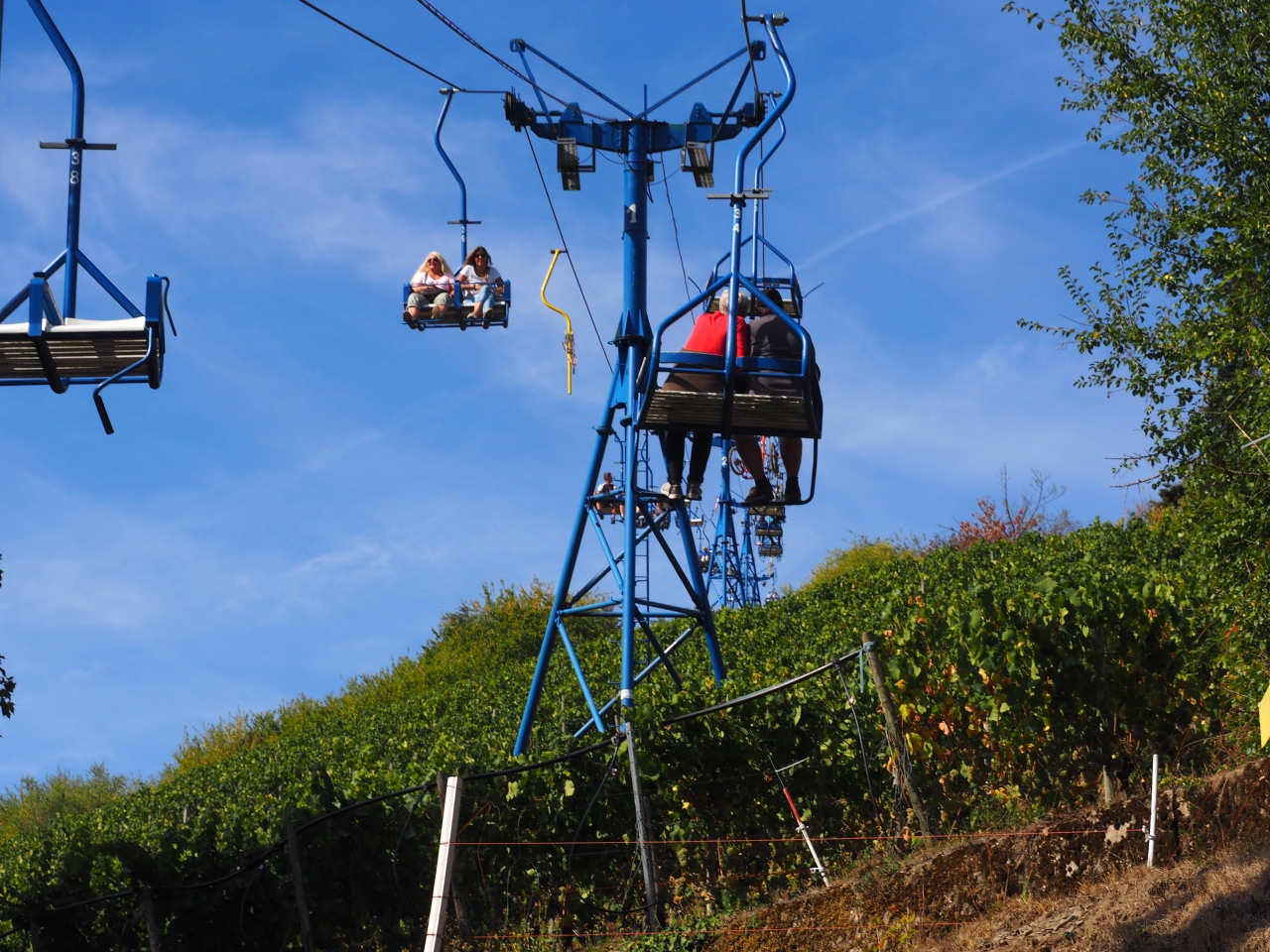 チェアリフトは葡萄畑の上を進み、ライン川渓谷やミュールタール川の谷が俯瞰できます。体を支えるのはベルト付近と足元の2本の鉄棒だけなので、それなりにスリリングな体験です。