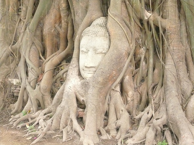 アユタヤの中心地、ワットマハタート内の奥の木の根に入り込んだ仏頭は写真を見ればだれもがわかる有名な遺跡です。なんとも不思議な光景ですが、異民族の来襲で切り取られた仏像の頭が木が育って地上に露出したものだそうです。