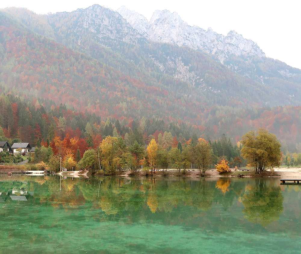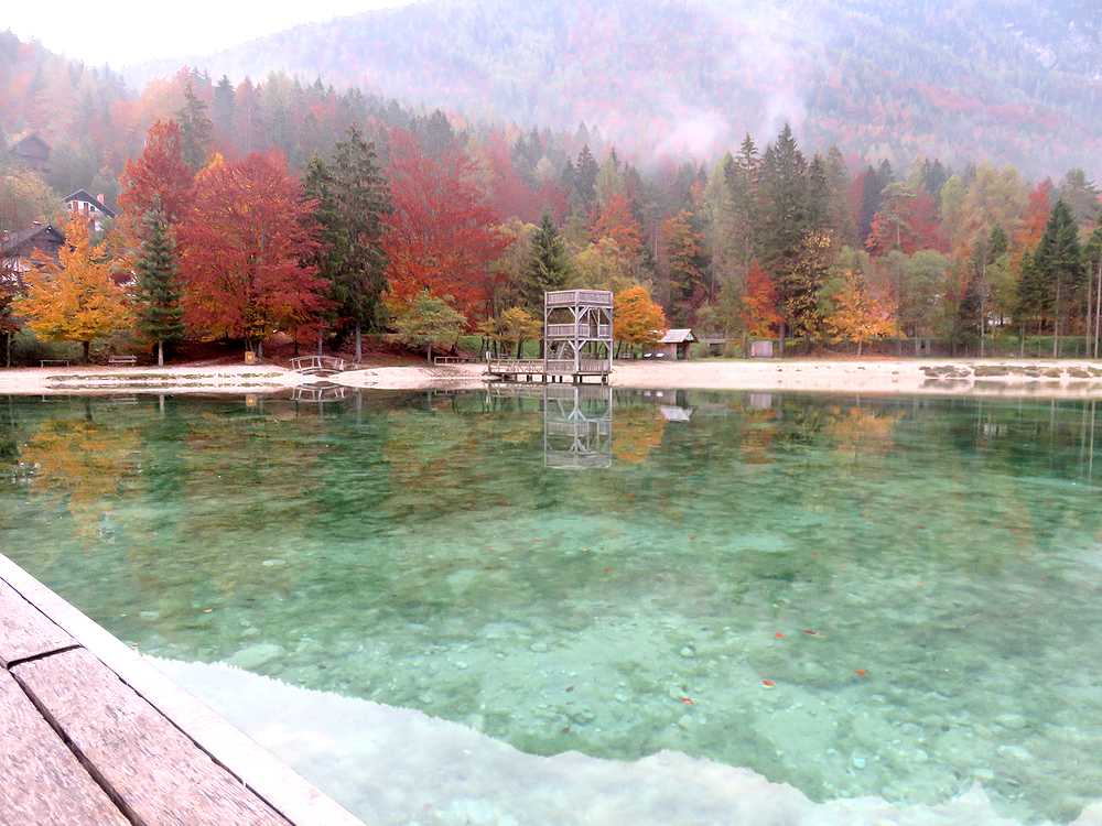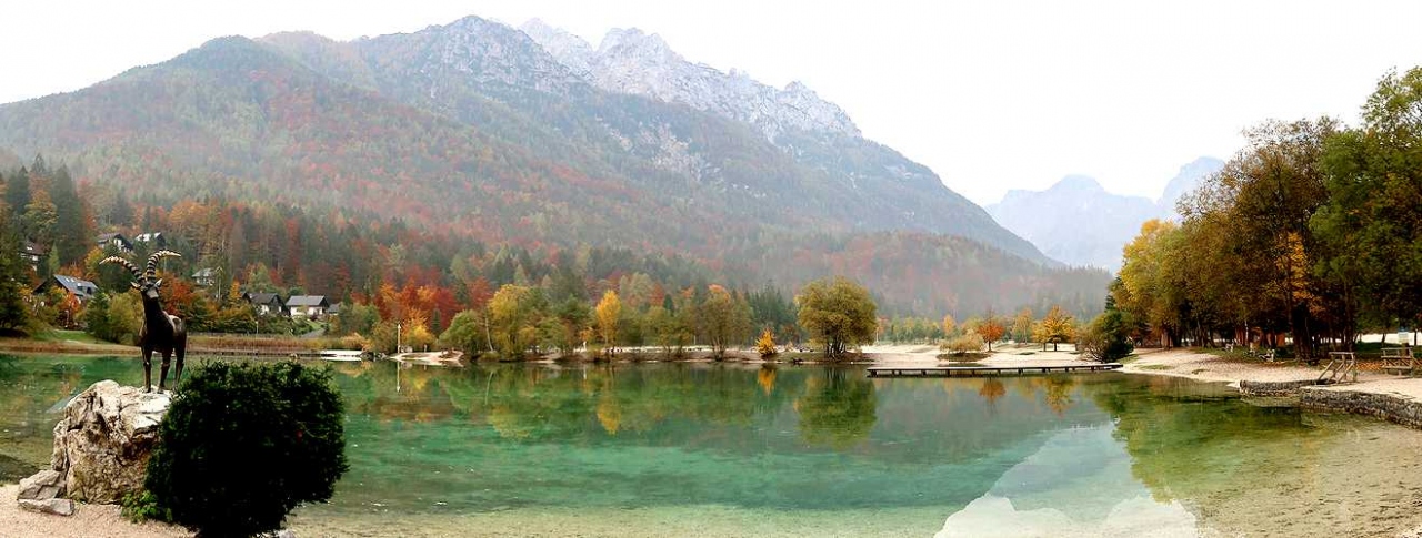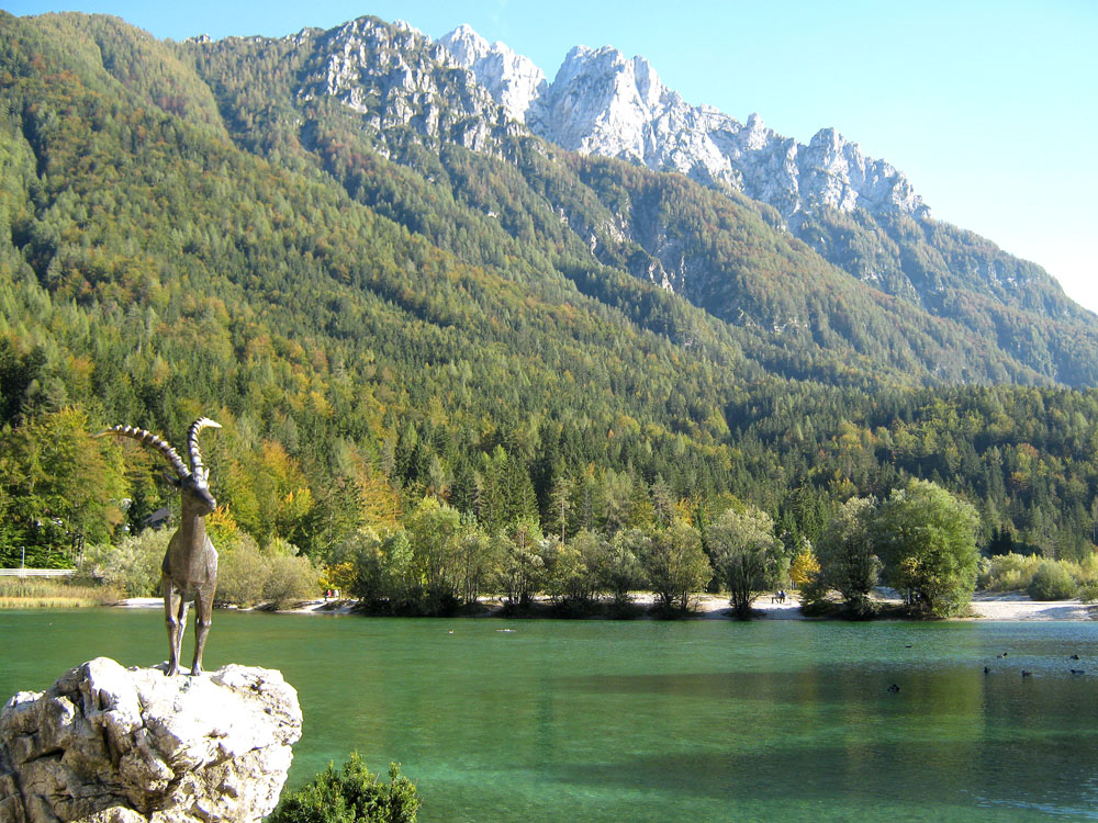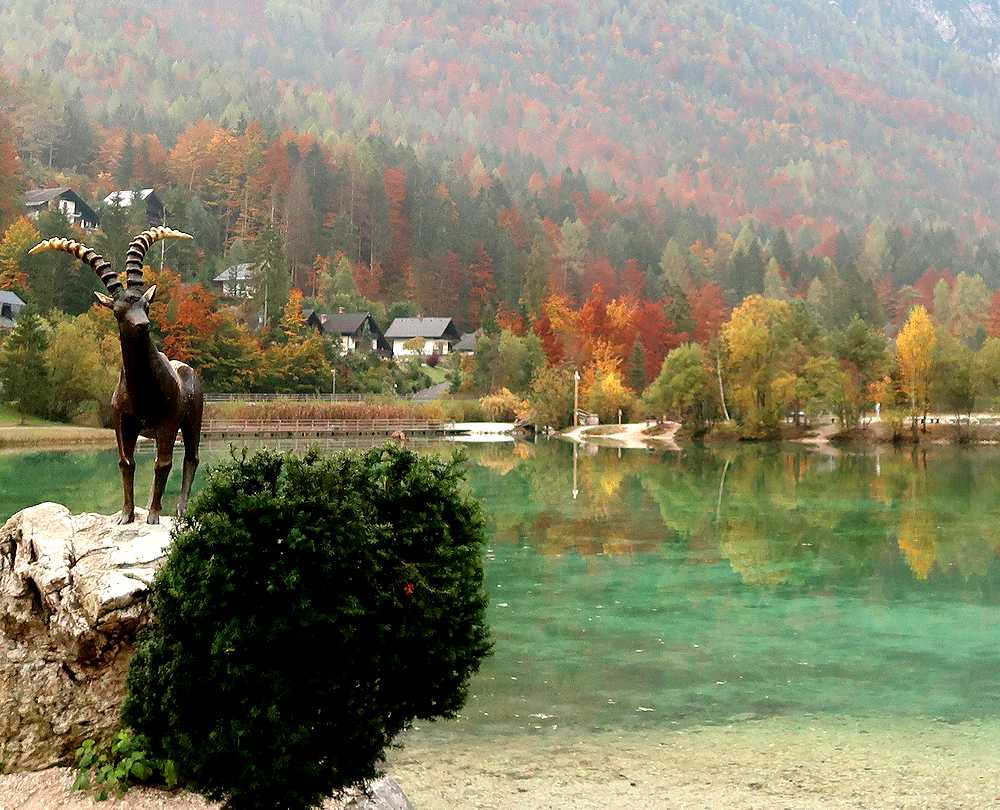 2009年の夏に続いて、2018年の10月中旬に訪問しました。今回は紅葉をねらって訪れました。盛りの最後のほうでしたが、紅葉がユリアンアルプス山塊とともに湖面に映り、美しい光景を作っていました。湖岸にはシュタインボックの像が立ち、アクセントとなっています。ユリアンアルプスが南側にあるので、晴れた日中は山が逆光になり、湖と山の両方をきれいに撮影することがむずかしいところです。