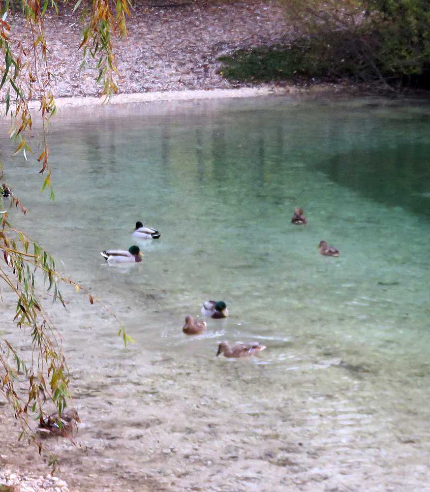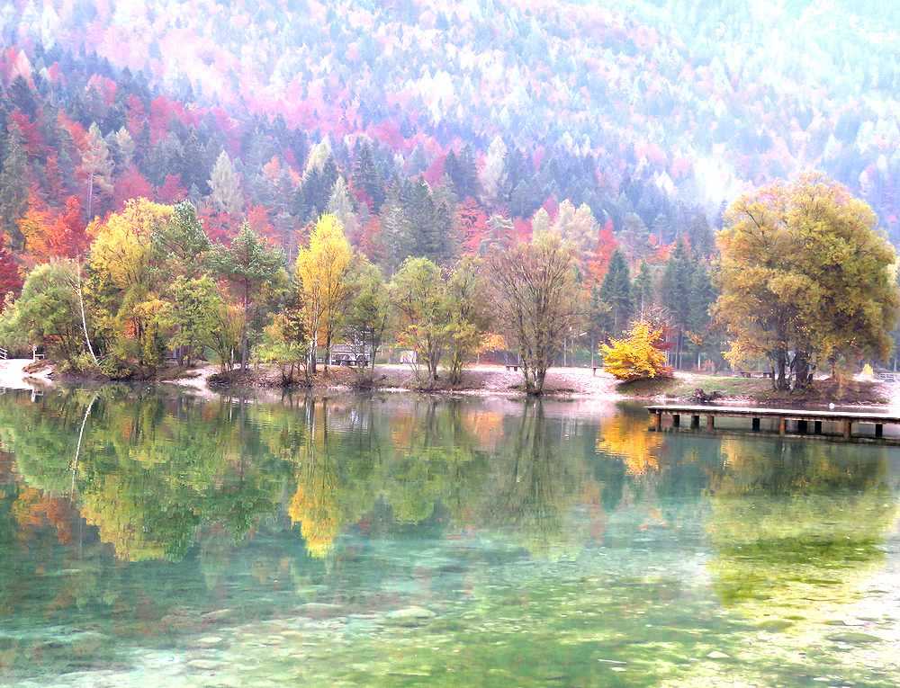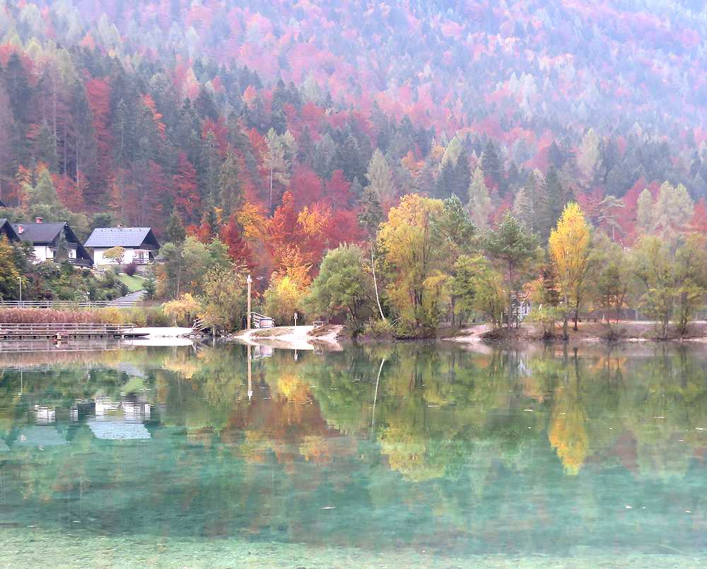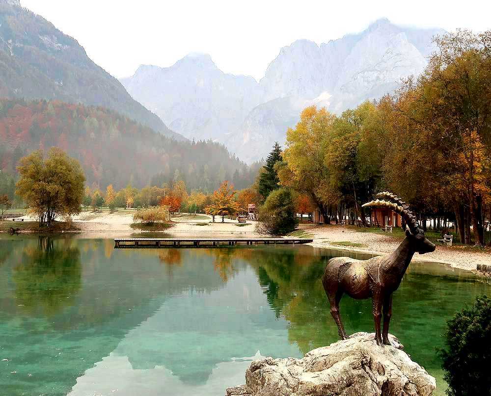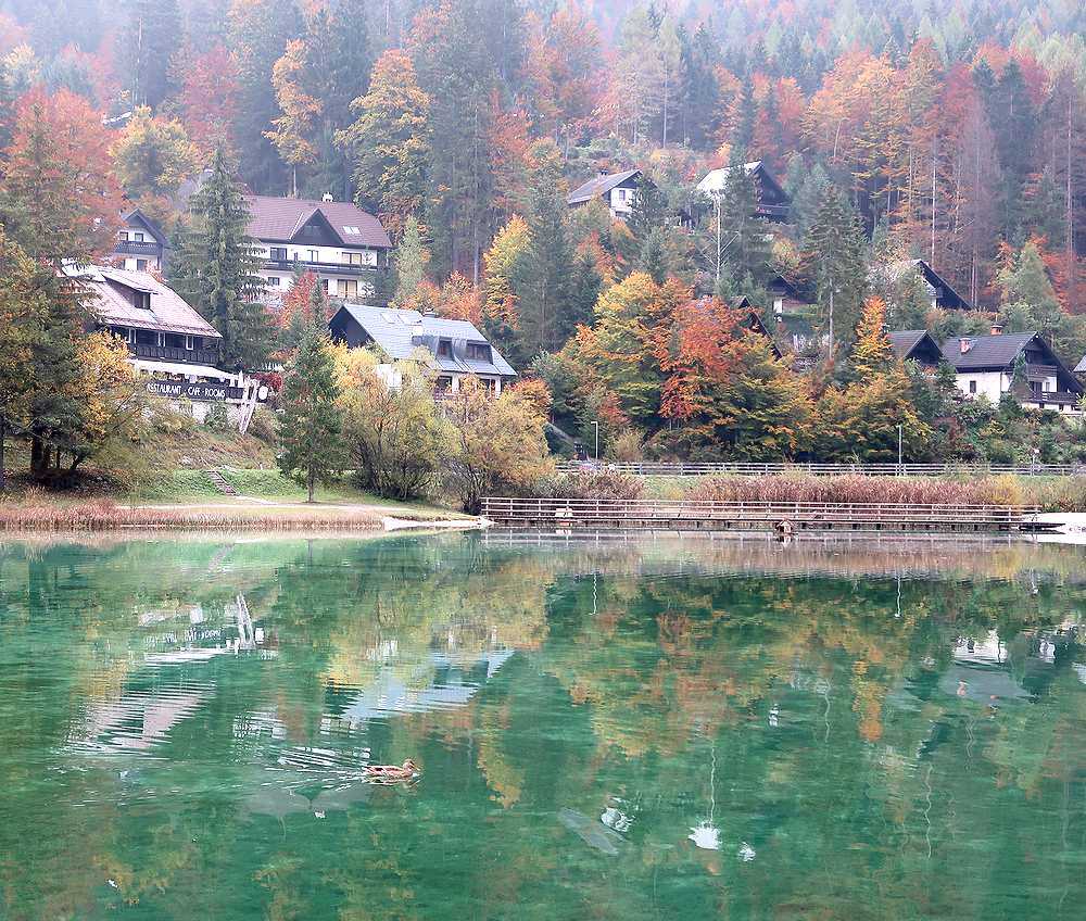 2009年の夏に続いて、2018年の10月中旬に訪問しました。今回は紅葉をねらって訪れました。盛りの最後のほうでしたが、紅葉がユリアンアルプス山塊とともに湖面に映り、美しい光景を作っていました。湖岸にはシュタインボックの像が立ち、アクセントとなっています。ユリアンアルプスが南側にあるので、晴れた日中は山が逆光になり、湖と山の両方をきれいに撮影することがむずかしいところです。