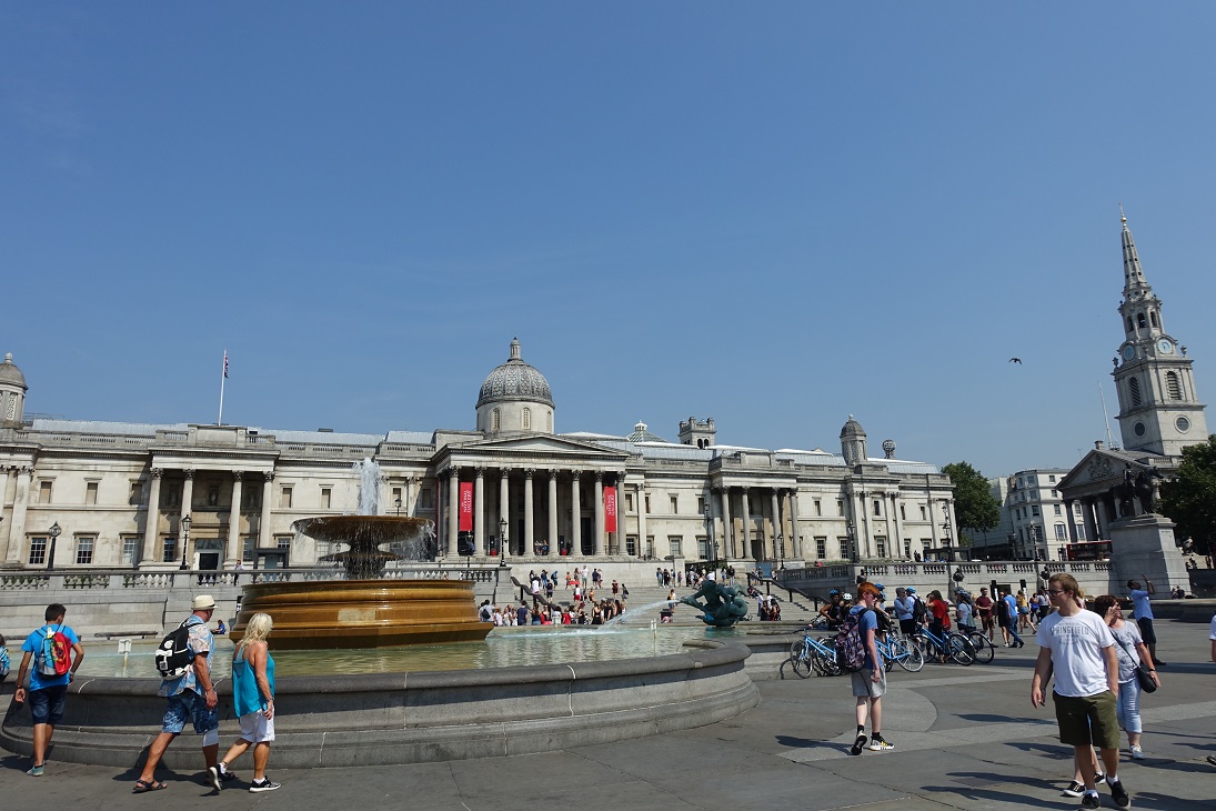 ピカデリーサーカスからほど近いところにあるロンドンの中心地にある広場で、中央にある大きな噴水やライオンの像がシンボルです。大勢の人でにぎわっていて、噴水やライオンの前では、写真を撮る人でいっぱいでした。