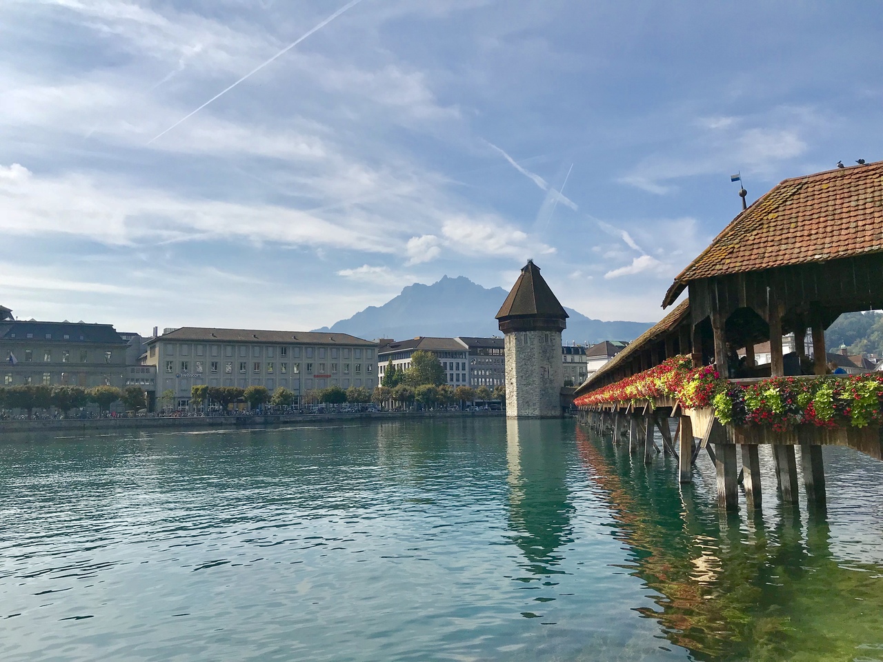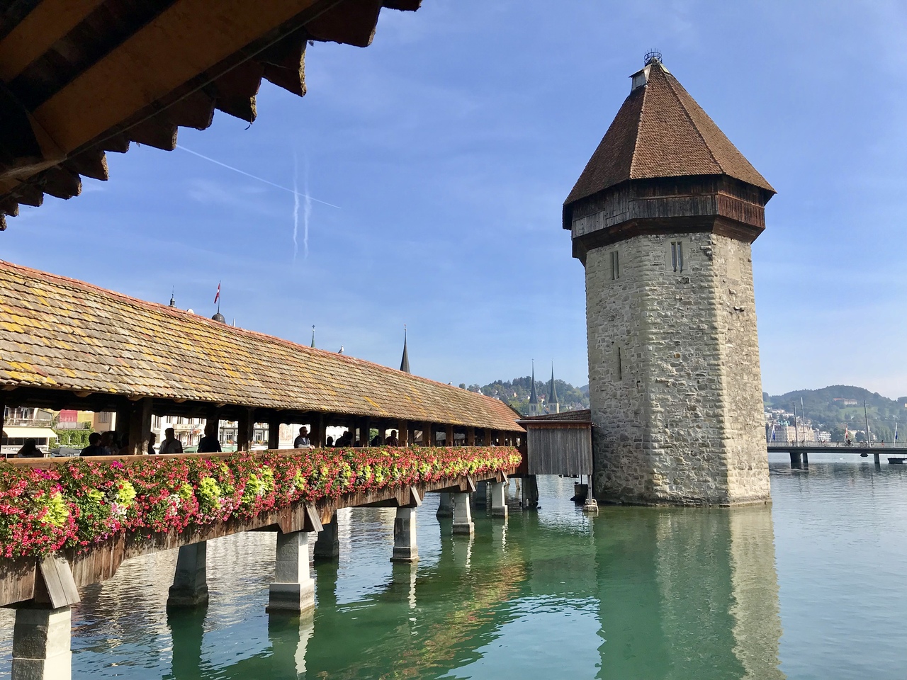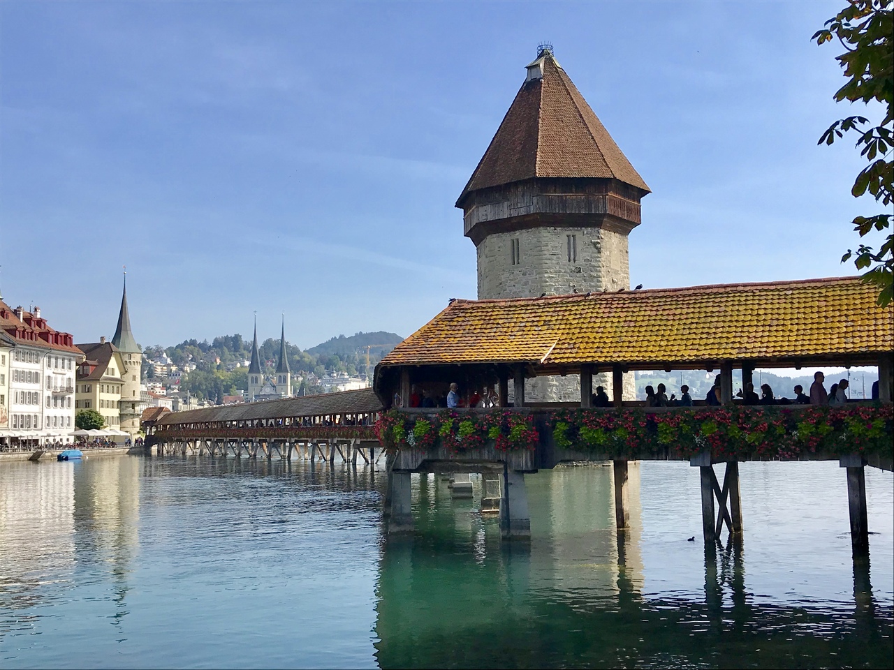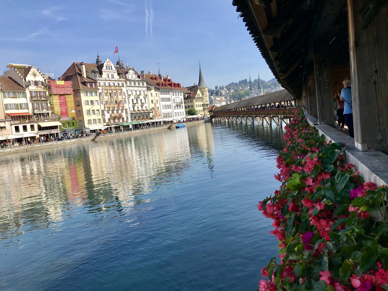 ルツェルンの街を流れるロイス川にかかる屋根のついた美しい木造の橋。