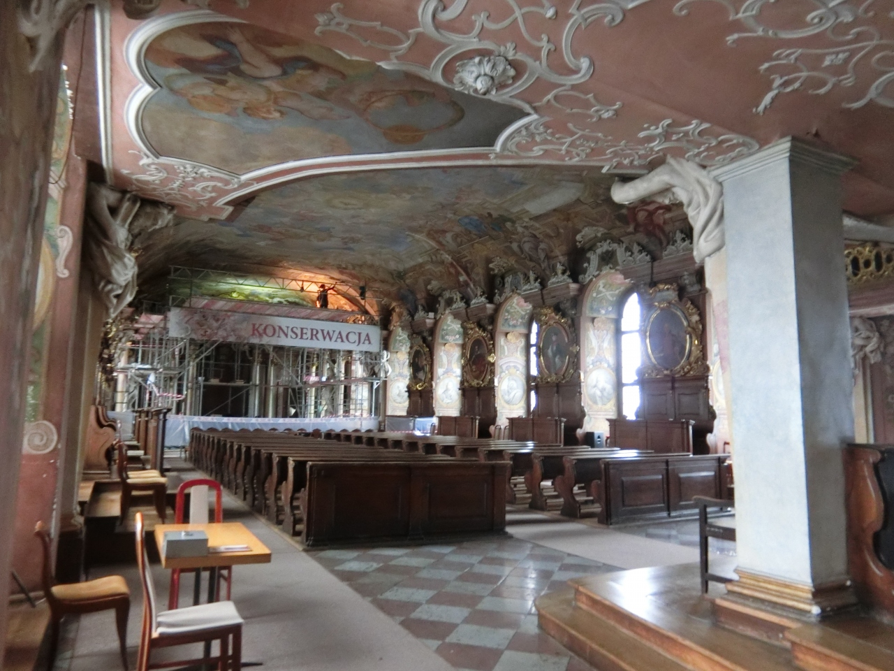 ヴロツワフ大学に来たら、まず入口に教授という小人がいます。いつも本を読んでいるそうです。ヴロツワフ大学の本館は神聖ローマ皇帝レオポルド1世が建てたものだそうです。ここの講堂の天井画がすばらしい。バロック様式で見事な装飾と一面に描かれている絵に圧倒されます。
