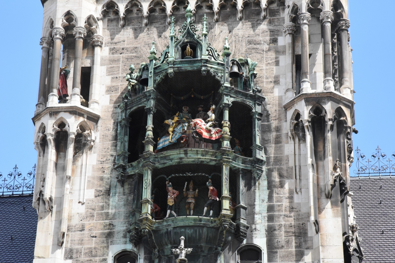 ・仕掛けの物語は1568年に行われたバイエルン大公ヴィルヘルム五世と、ロートリンゲン公女レナーテの結婚式の祝宴をテーマとしています。馬上槍試合の場面では、バイエルンのシンボルカラーである白と青の旗を馬に付けた騎士が勝つことになっており、その後、ビア樽職人がくるくると回って踊ります。遠くからだと気づき辛いかもしれませんが、これらの人形は全て等身大で作られています。