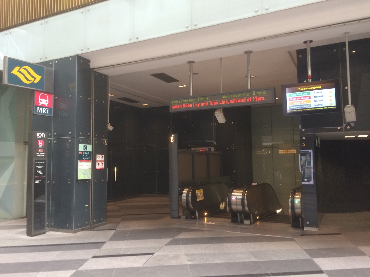 オーチャードロード沿いの繁華街にある駅なので旅行者ぽい人がたくさんいました。切符を買う販売機があり一回のみの券を購入。一回券は料金より10セント高い運賃です。地下鉄の駅ですが広い構内でした。出入口は3箇所の出入り口があります。