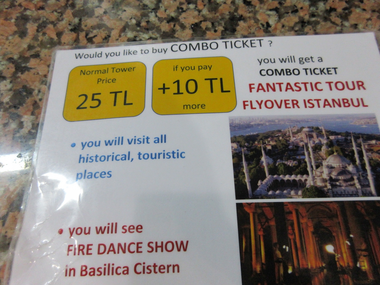 カラキョイ地区にある石造りの搭で,エレベーターで上まで上がることができます.搭の外観は昔の雰囲気ですが,内部はすっかり現代的で,名古屋城のようにエレベーターやお土産屋が付いています.それでも,上に上がるとイスタンブールの旧市街が一望でき,金角湾の位置や形も良く判るので,かつてのイスタンブール攻防戦を想像するには良い場所です.