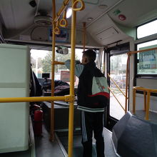 ドアは助手席の位置にある1か所のみ。車内は混んでいることが多く、立ち乗り必至ですが、立っていると窓から外が見えないので、たまに屈んで場所を確認したりしました。