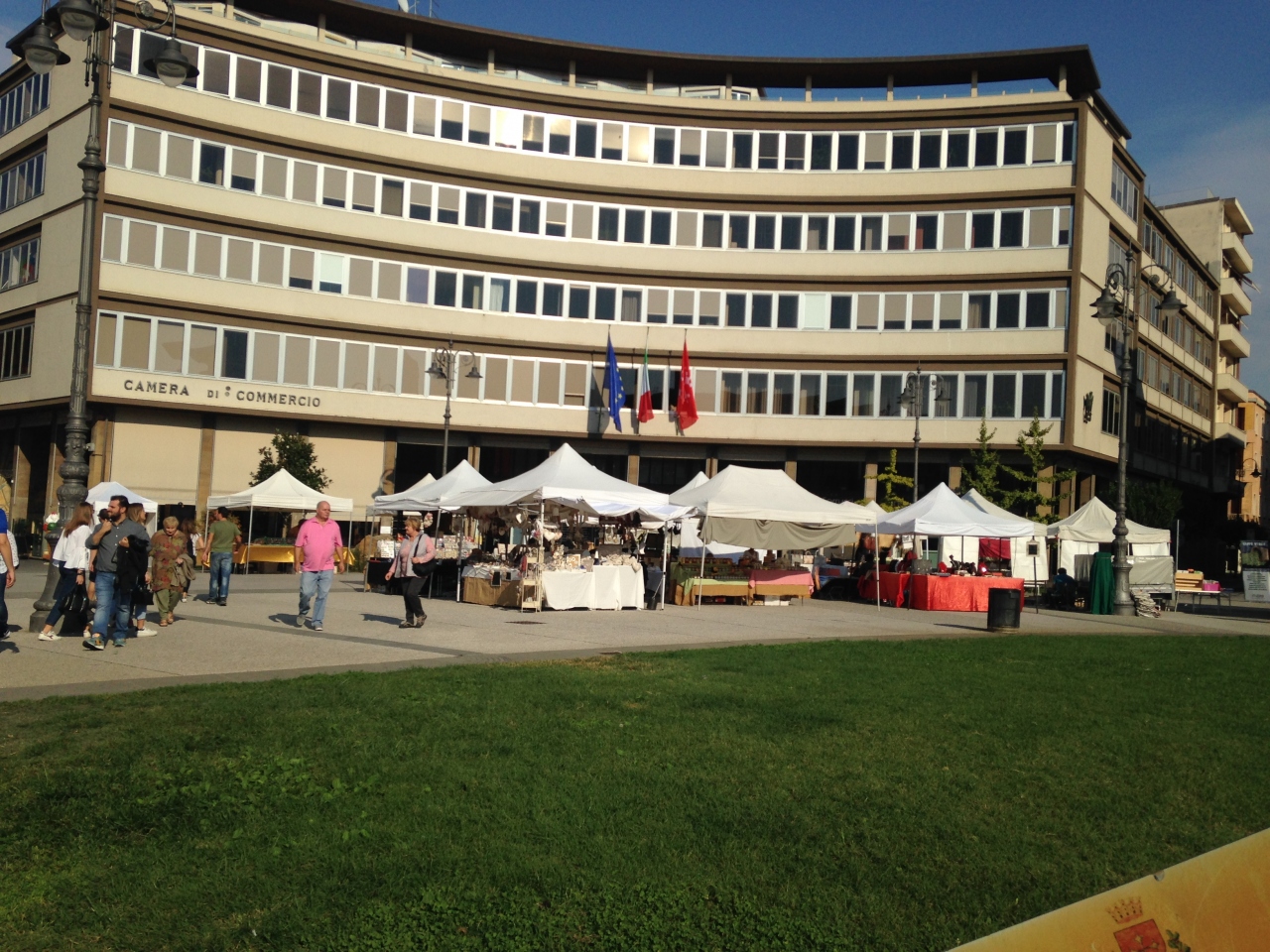 ピサ中央駅から北上するとある広場で広場の周りはロータリーになっており、県庁やホテルやカフェなどが周りに建っています。広場内ではお土産物屋の青空市があり、にぎやかでした。この広場を中心に通りが何本かありますが、ピサの斜塔にショートカットで行くにはサンタマリア通りをおすすめします。