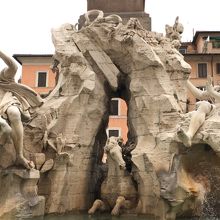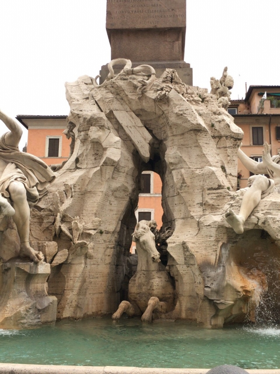 ナヴォーナ広場には三つの噴水があります。この四大河の噴水は真ん中にあります。上に高く、とても大きな噴水です。迫力があります。