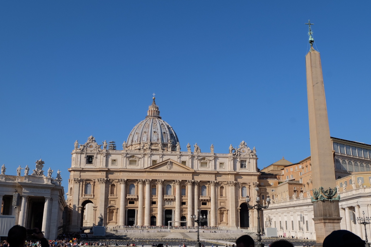 バチカン市国にある、サンピエトロ大聖堂の前にある広場です。広場自体は楕円形になっていて、中央にオベリスクと呼ばれる記念碑がたっており、周りには噴水などもあります。大聖堂もきれいに見渡すことができ、とてもきれいな景色でした。人も多く、美術館の入場待ちの方がずらりと並んでいました。