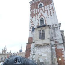 中央広場にある建物で織物会館の横にあります。高い建物で塔の上部には大時計があります。この旧市庁舎の塔にも上ることができますが、行った時はすごい雨が降っていたので上りませんでした。この市庁舎の前には、横を向いた顔だけの像があるのも面白いです。