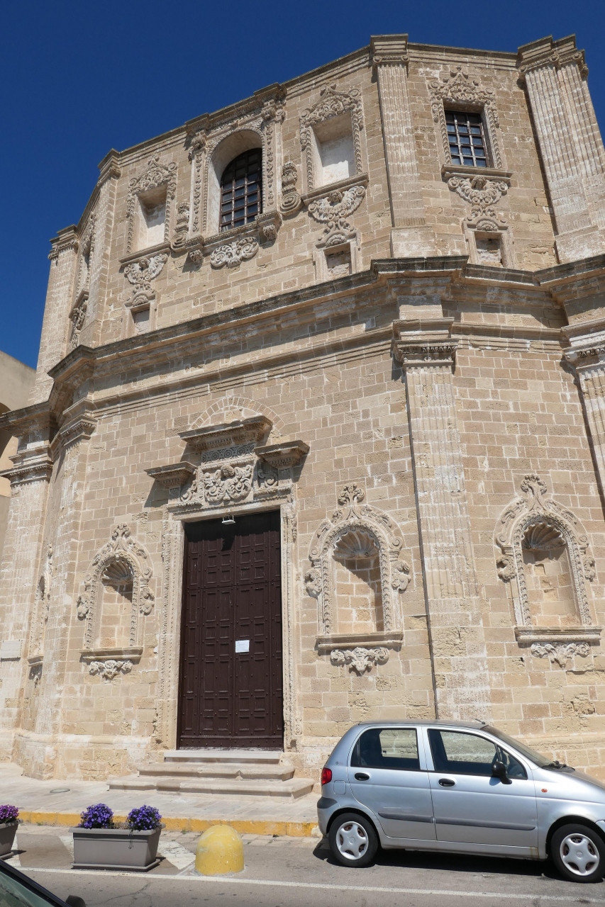ガリポリ旧市街を抜けて海岸淵のリヴィエーラ・サウロ通りに出ると、数十メートルの範囲に三つの教会がありました。その一つがサン ドメニコ アル ロザリオ教会(Chiesa di San Domenico al Rosario)です。1696年に建てられ、小さめの落ち着いた感じの教会です。旧市街にある古い石造りの家とあまり違わない外見ですので、十字架が無いと教会であることに気付かない可能性もあるように思います。