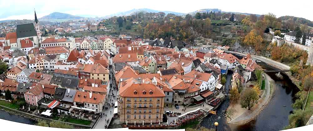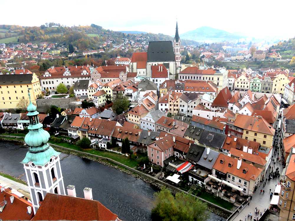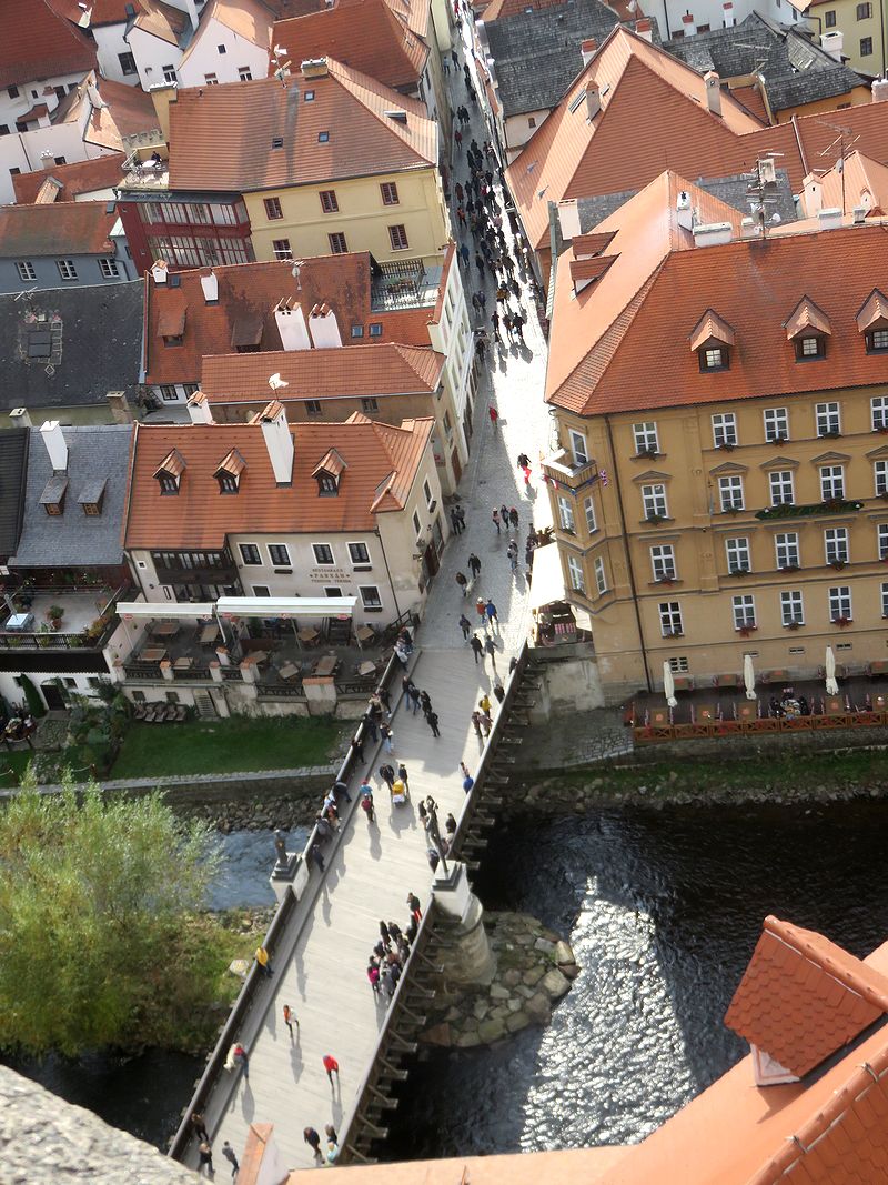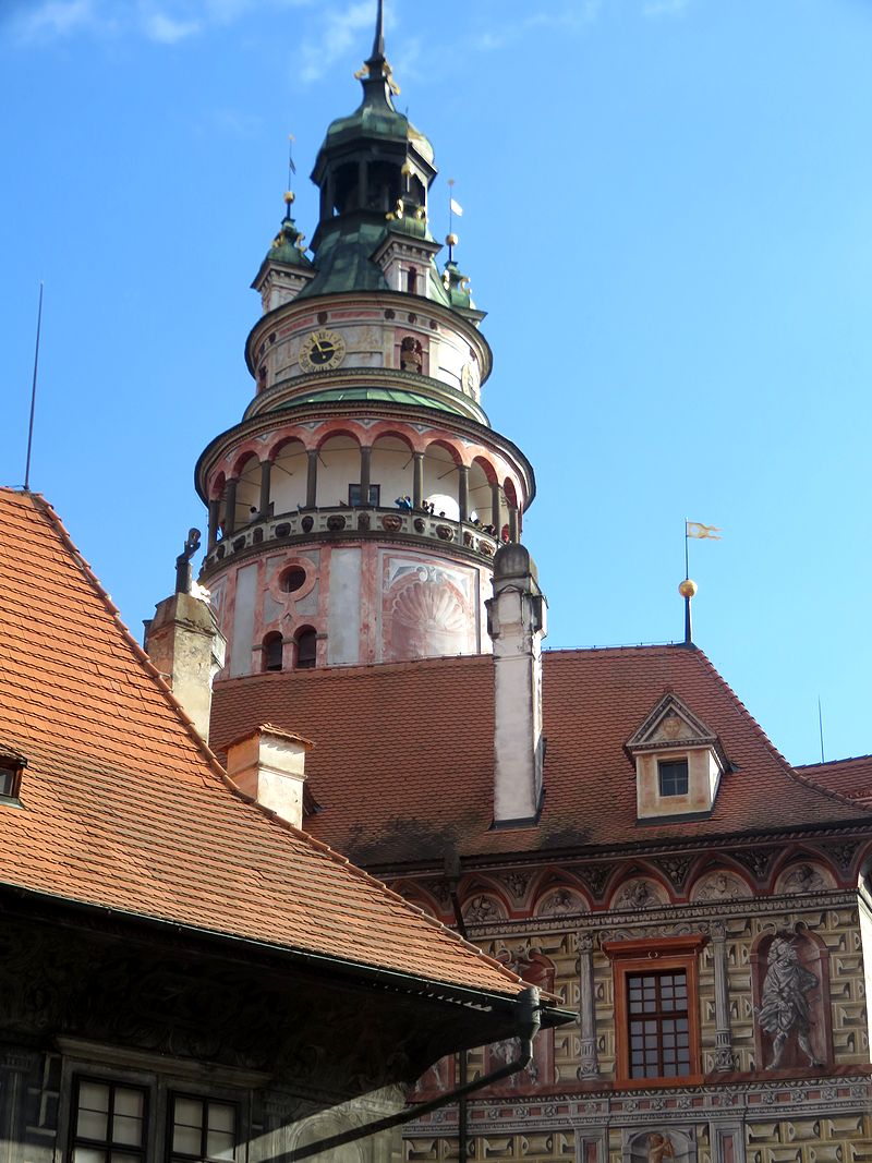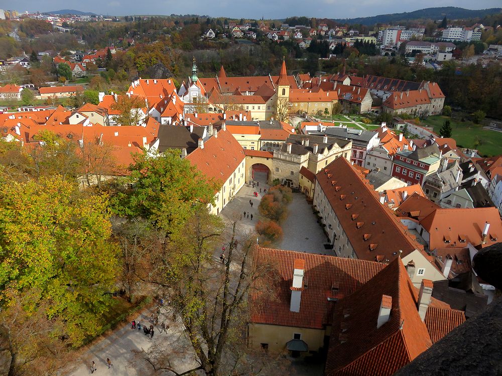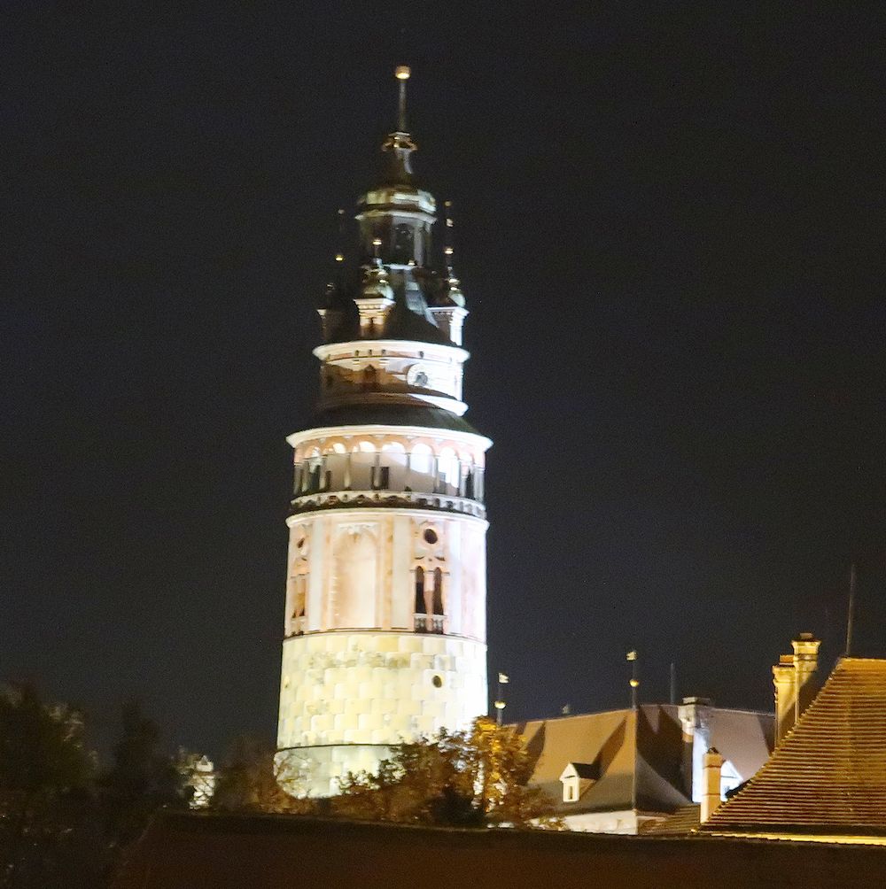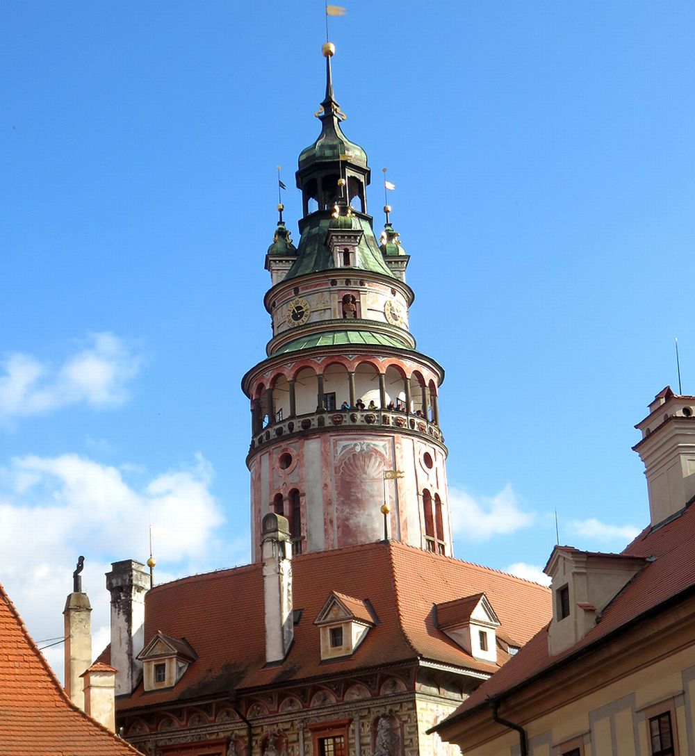 塔の入り口へ入る階段を数段上がったところにバーコード読み取りによる機械式出入り口があり、チケット売り場は奥の建物の中に入ったところにあります。わかりにくいので、私達は2度目の訪問にもかかわらず、最初戸惑いました。近くにいた人に尋ねて、買うことができました。160段あるという木製の狭い階段を登ると360度の大パノラマを目にすることができます。正確には階段の出入り口があるので、340度くらいでしょうか。展望台は完全には一周できません。ここからのチェスキークルムロフの街並みと川やお城の中庭などの眺めは必見です。ただし、市庁舎のある広場方向の眺めは南側になり、昼は逆光になるので、朝か夕方に登ることをお勧めします。最近は狭い展望台でカップルが自撮り棒での撮影に夢中になっているのをみかけますが、迷惑にならないように撮影してほしいと思います。塔は夜ライトアップされますが、思ったほど明るくはなく、がっかりでした。