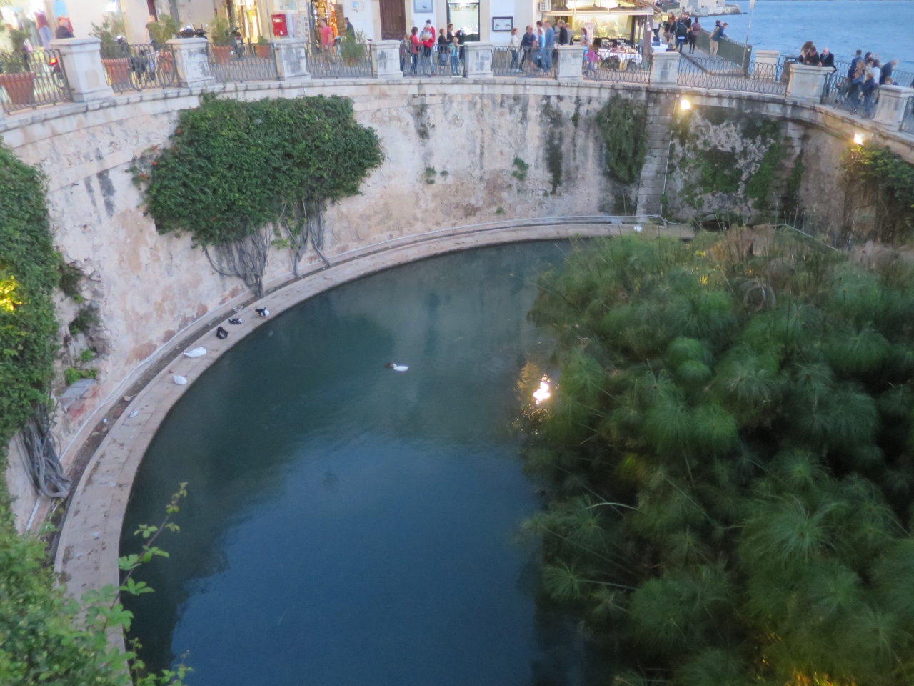 海のすぐ横に真水が湧き出している。そのような泉は世界中各所にあるけれども、ここは周辺の町並みが非常に美しいこともあって一層素晴らしく思えました。青く澄んだ水は大変きれいで魚が泳いでいるのも見えます。また泉の畔にはパピルスが生えていて、その緑もまた相乗効果で美しいものでした。