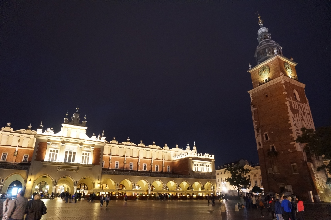 クラクフの中心となるのが中央広場です。ここは4万㎡もあるとても広い広場で中世の雰囲気が残っています。馬車なども止まっています。広場の中央には昔、生地や織物などが売られていたとても大きな織物会館があります。市庁舎や聖マリア教会などもあり、多くの観光客が集まっています。中央広場に面しているホテルに泊まりましたが、夜遅くまでうるさかったです。