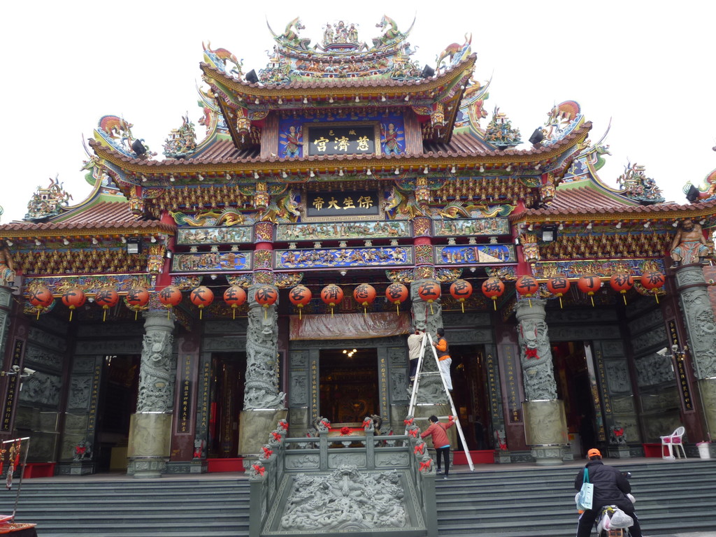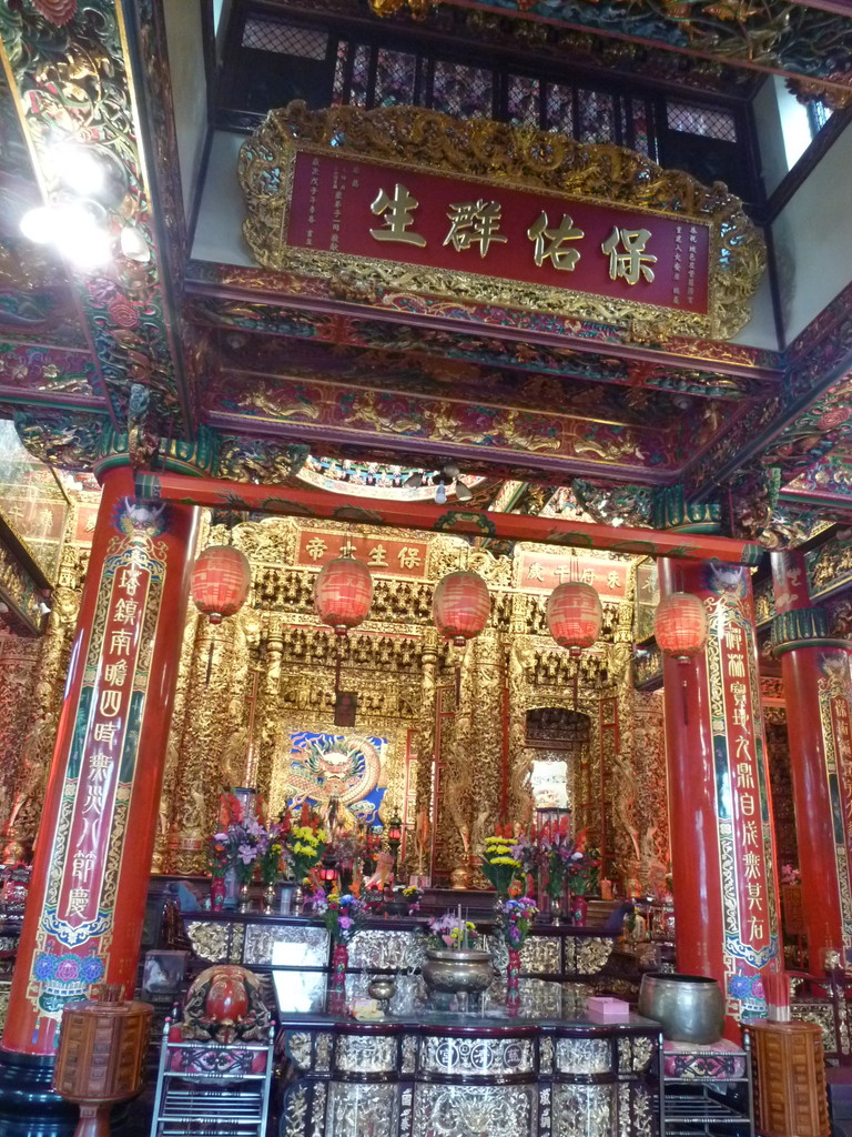 豪華な大きなお宮で、赤い瓦の屋根と見事な彫刻のグレーの柱のコントラストはいいです。中の入ると一変して朱色の柱や壁に、金箔の文字や装飾が施されていました。