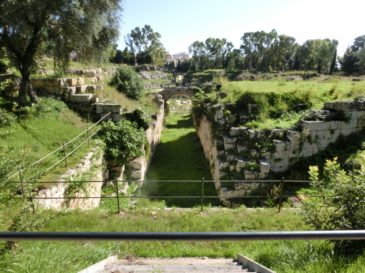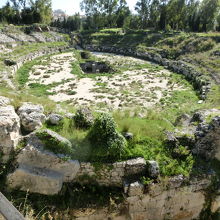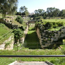 考古学公園を入って左側にある古代ローマ帝政時代の円形闘技場です。公園入口に古代ローマの水槽跡がありましたが、闘技場で模擬海戦をする時の水はそこから供給されたようです。剣闘士が入場するアーチ門が二つ残されていて、『ポンペイ』などの映画で見た剣闘士の姿が蘇ってきました。観客席部分は、上の席が崩れているからか、物足りない感じです。本来はまわりの樹木の高さ位まで、席が作られていたそうです。