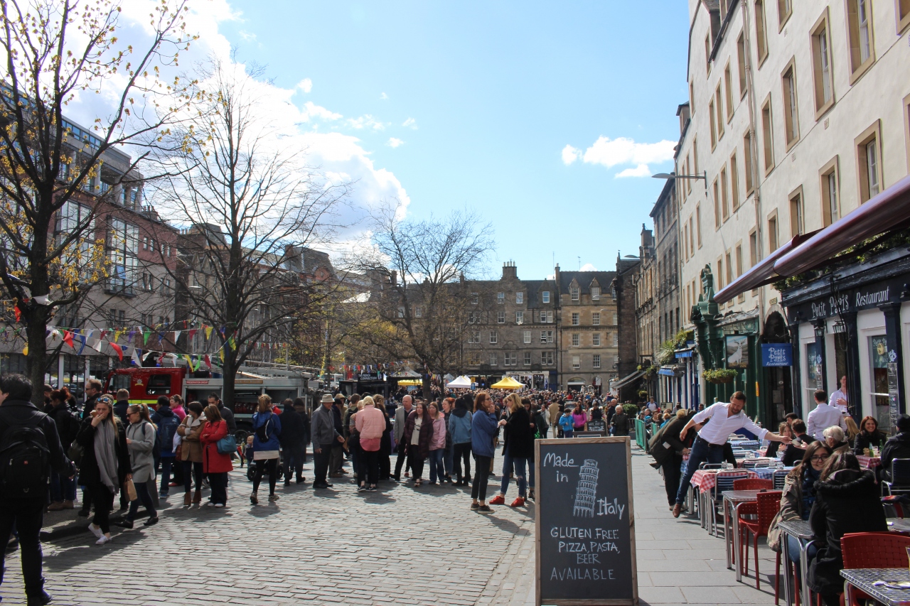 グラスゴーからエディンバラへの日帰り旅行で訪問しました。エディンバラ城を見学下あとに坂を下っていくとマーケットにたどり着きます。市場のような雰囲気ではなく賑わった広場とお店がたくさんあります。週末は混雑していました。