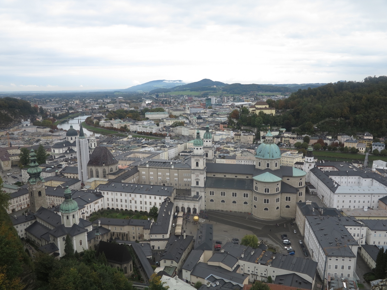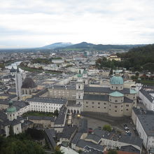 ザルツブルク市街のどこからでもその城壁を見ることができます。城へはケーブルカーで登りますが、ザルツブルクカードがあると、それが乗車券になるため自動改札にタッチするだけで乗車できます。切符売場は混雑していることもあり必須と言ってもよいと思います。城からは市街を一望できましたが、山を縫うように流れる川に沿って開けたザルツブルクの街の景観は意外にも日本の内陸の地方都市と共通するものを感じました。市街地と反対側はアルプス山脈の一端をのぞむことができます。