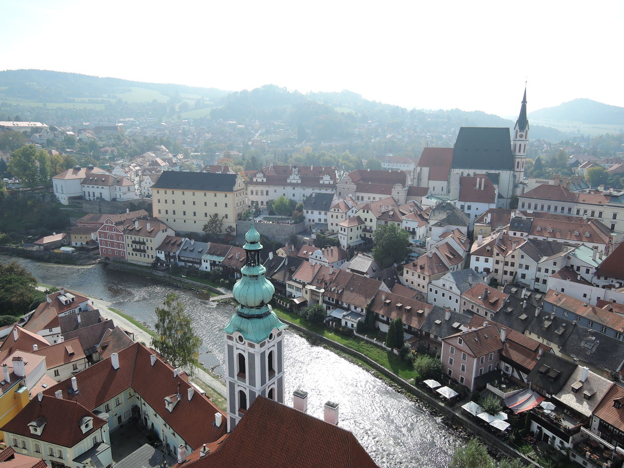 チェスキークロムロフ城の塔に登ると蛇行するブルタバ川と赤い屋根と白い壁の美しい歴史地区が見渡せます。