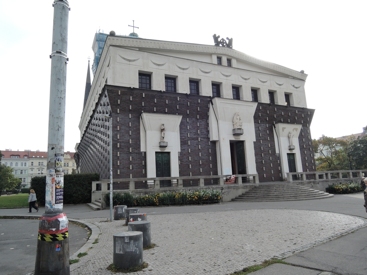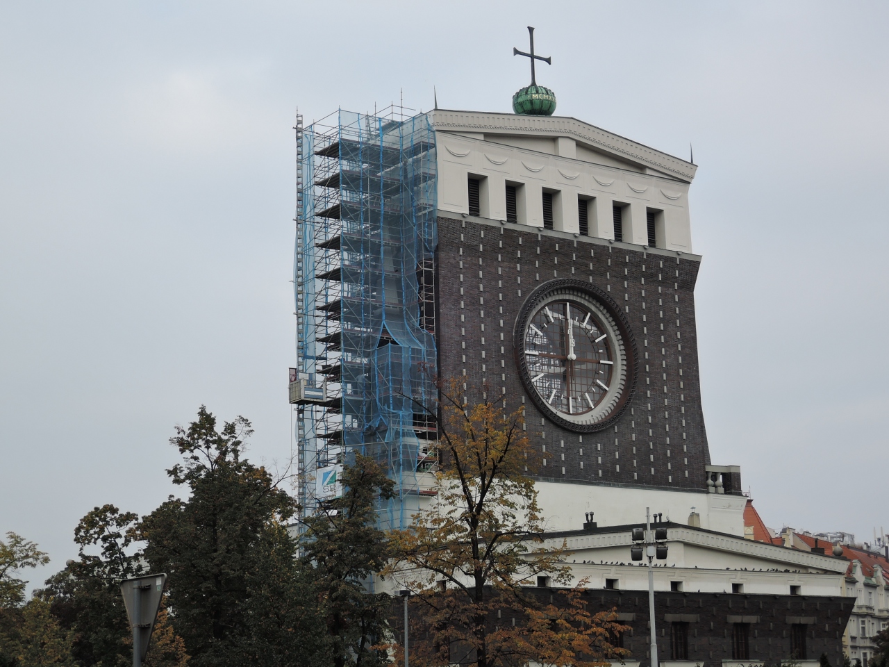 借りていたアパートから観光に行く時、Jiřího z Poděbrad公園を通りました。公園の中に大きな教会がありました。外観はあまり教会らしくなく、市民センターのように見えました。後ろの大きな時計の部分は工事中でした。