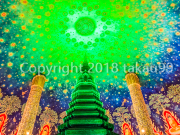 BTSタラートプルー駅からソンテウで行きました。ソンテウ降りてから5分ほどあるきます。お目当ての有名なグリーンの天井画と仏塔は大きな白い仏塔の最上階にあります。下の各フロアも展示室のようになっています。