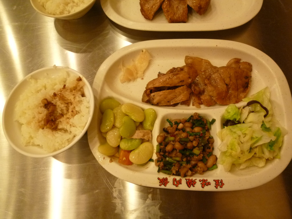 妻と散歩の帰りに佳味燒肉飯華夏店に寄りました。今夜は焼肉飯でなく、焼肉弁当(焼肉定食)にしました。妻は、排骨弁当を注文しました。肉の他に好きな野菜を三種類選べます。妻が野菜を選んでくれたのですが、焼肉を含めて、全部美味しかった。味噌汁はフリーです。値段は80元。