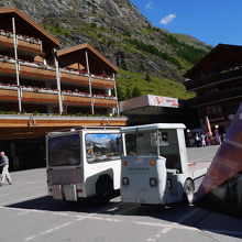 登山鉄道の終着駅で、駅は小さいものの、世界中からのマッターホルンの登山客で賑わっていました。駅を出るとすぐに、ツェルマットのメインストリートが伸びているので、ロケーションも問題なく、駅前には電気自動車や馬車が止まっています。