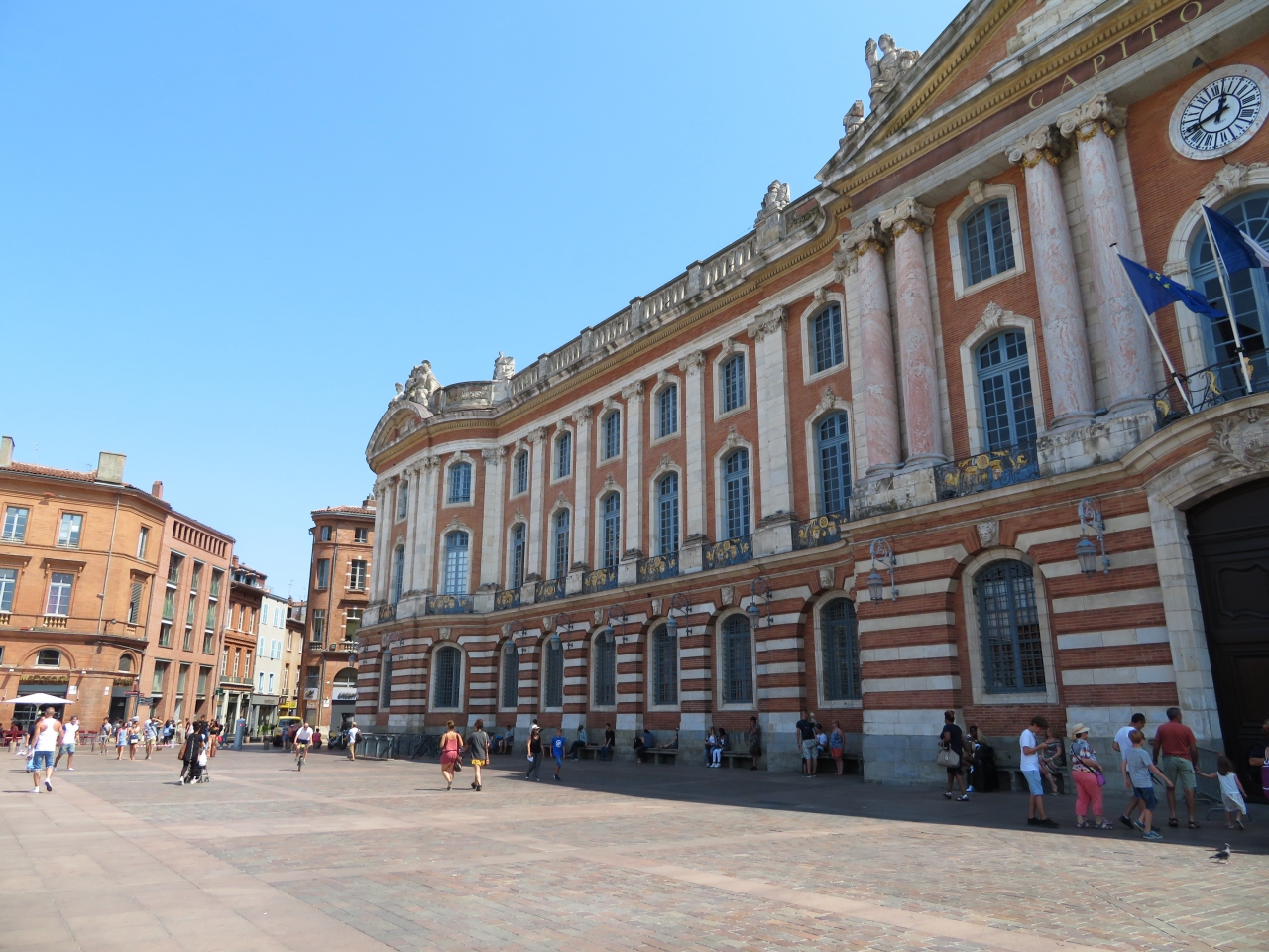 1760年に完成した市庁舎は、絶対王政下のトゥールーズ市参事会「キャピトゥール」から「キャピトル」と呼ばれています。バラ色の街と呼ばれるトゥールーズを象徴するように、赤レンガの壁が夕方には、夕日に映えて非常に綺麗です。