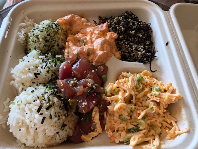 ごはんは2つ、ポキ2種類、サイド種類で16ドル2人でシェアしてちょうどよかったです。