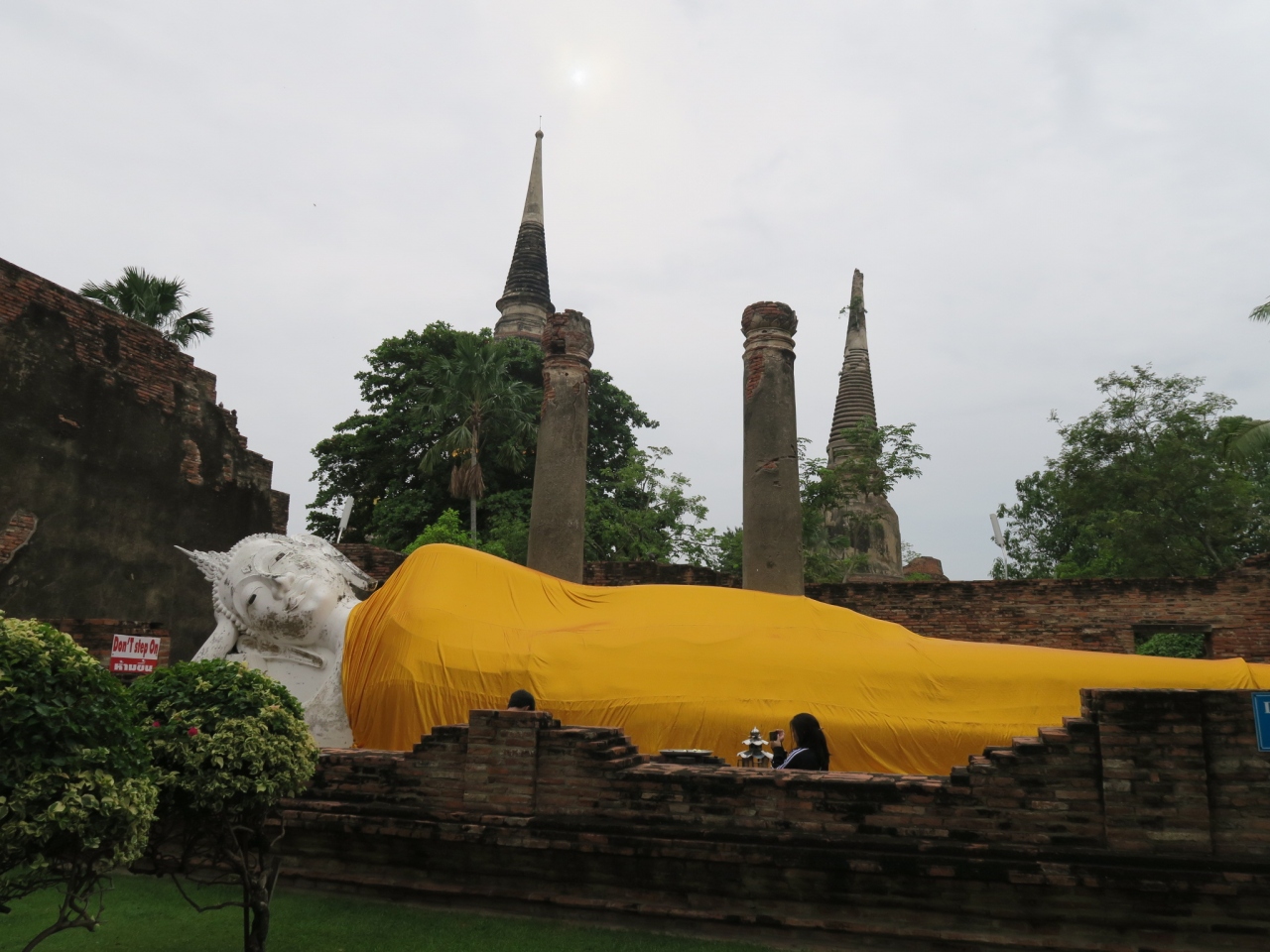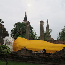 ワット ヤイ チャイ モンコン (チャオプラヤー タイ寺院) の敷地内にあり、入って直ぐ左手壁の裏で寝ておられます。こちらはオレンジの袈裟を羽織っています。