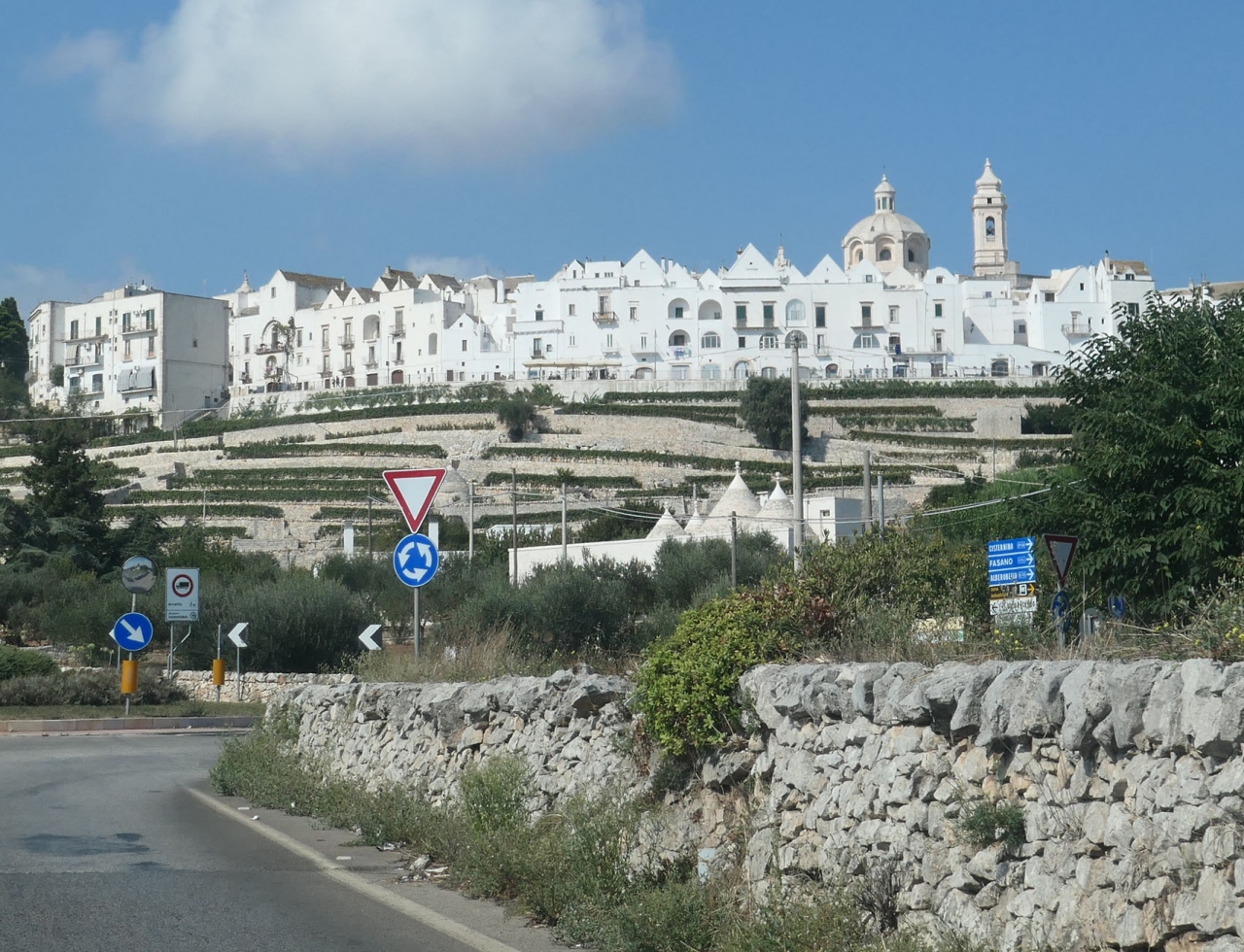 レッチェからマルティナ・フランカを経由してバーリに車で向かう時に、緩やかな丘の上に白くて美しい建物群がある町を通りました。ロコロトンドで、旧市街には中世に建造された見事な教会が幾つかありました。丘の下からロコロドント旧市街を見上げると、聖ジョージ教会(Church of Saint George)の見事な尖塔が突出して目立っていました。丘の斜面や下部にキノコの家のようなトゥルッリも沢山ありました。トゥルッリで有名なアルベロベッロはロコロトンドから数kmの至近距離にあり、この付近では沢山のトゥルッリに出会うこともできます。旧市街道路は狭くて複雑なため、車で中には入れませんでした。外側からの見学でしたが、時間があればこの小さくて美しい旧市街をゆっくりと見学したいと思いました。
